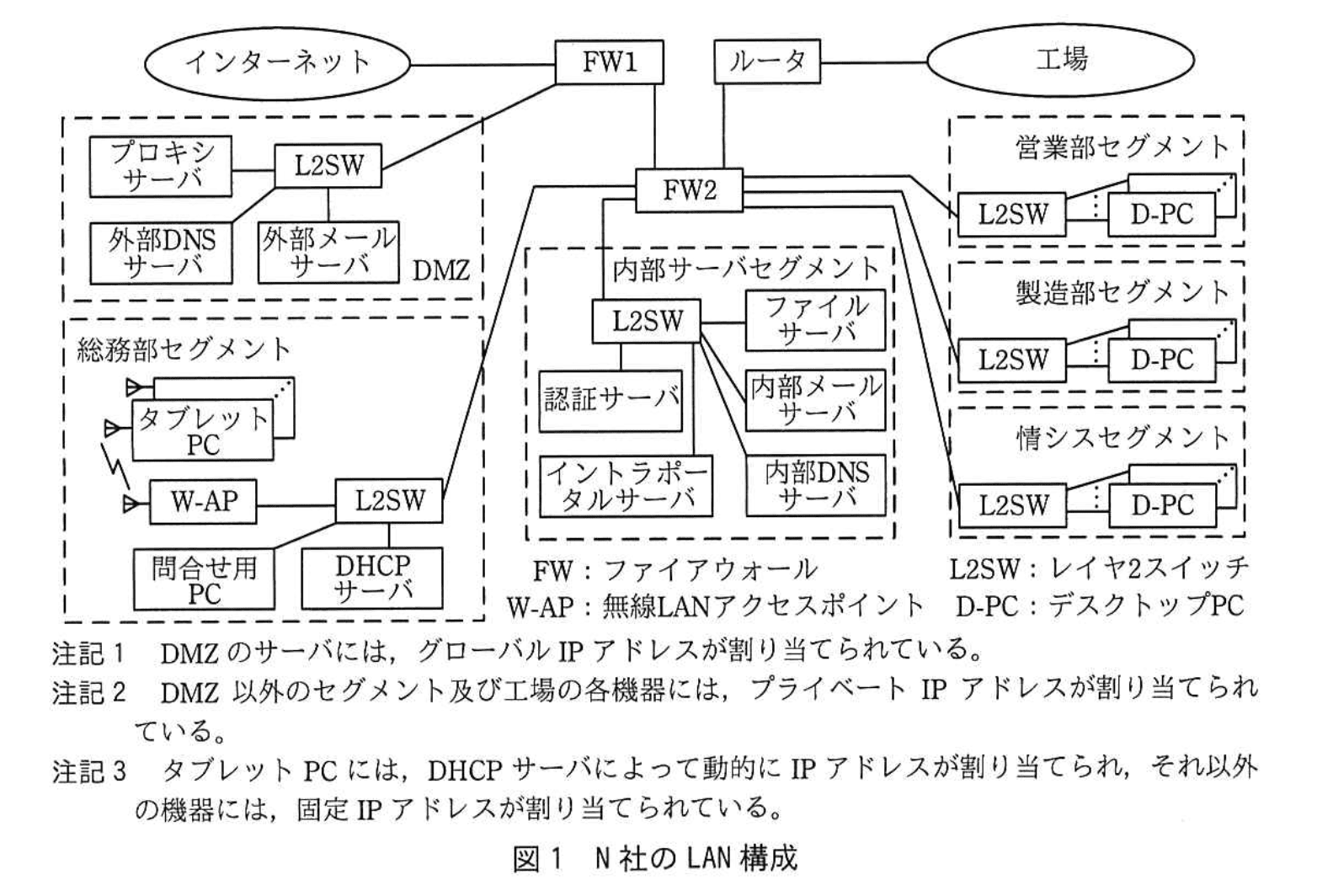 N社は、従業員数5,000名の化学メーカーであり、総務部、営業部、製造部及び情報システム部(以下、情シスという)がある。また、国内に工場がある。N社のLAN構成を図1に示す。