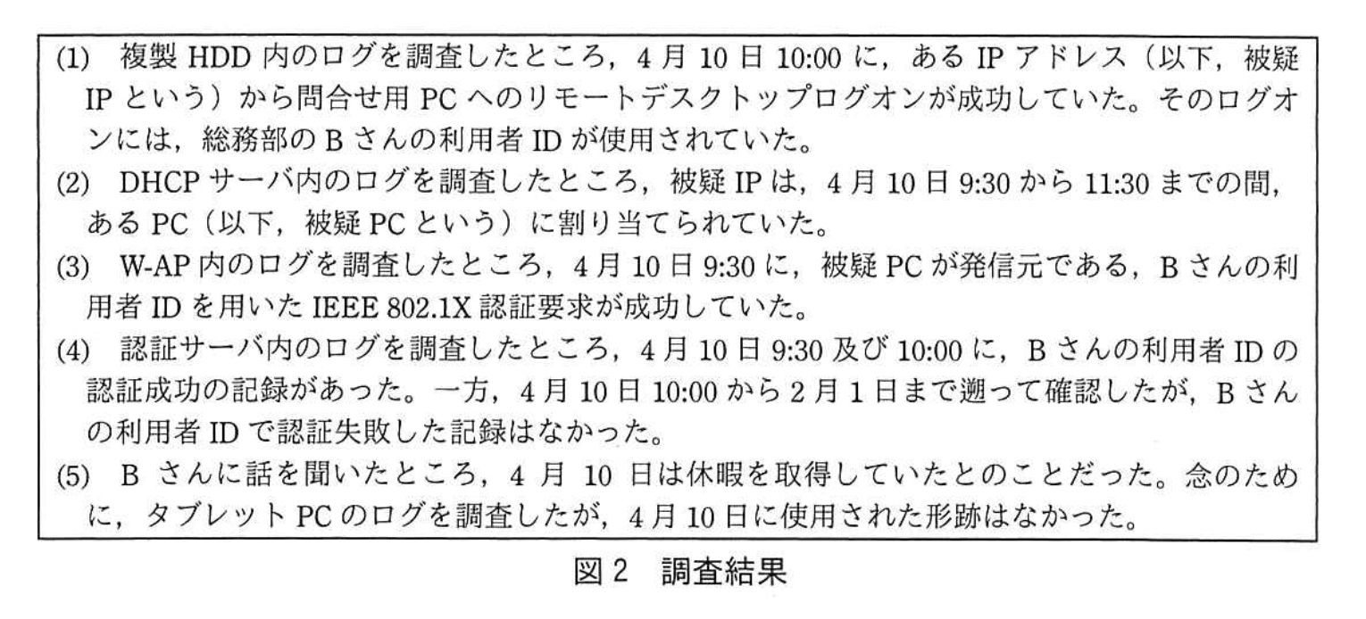 この調査結果から、P君は、攻撃者がBさんの利用者IDとパスワードを入手し、それらを利用して無線LAN経由で問合せ用PCに不正にログオンしたと判断した。