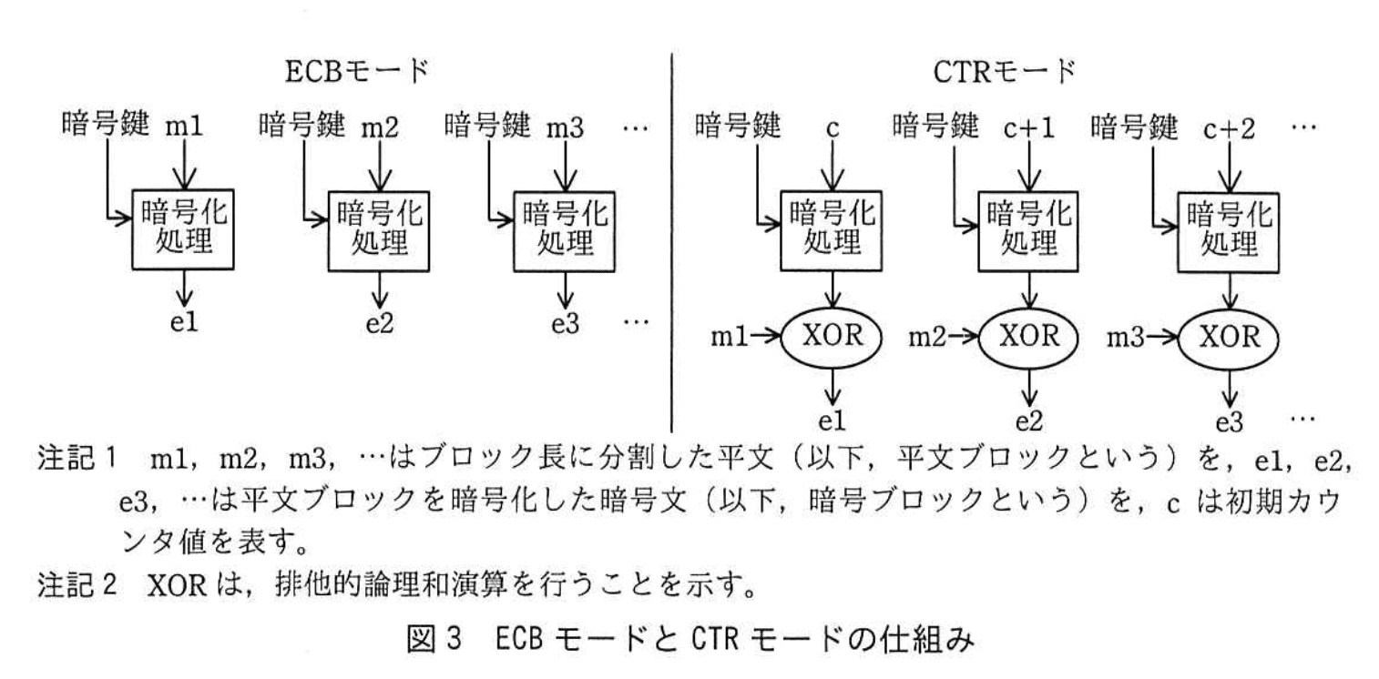暗号モードのうち、ECBモードとCTRモードの仕組みを図3に示す。