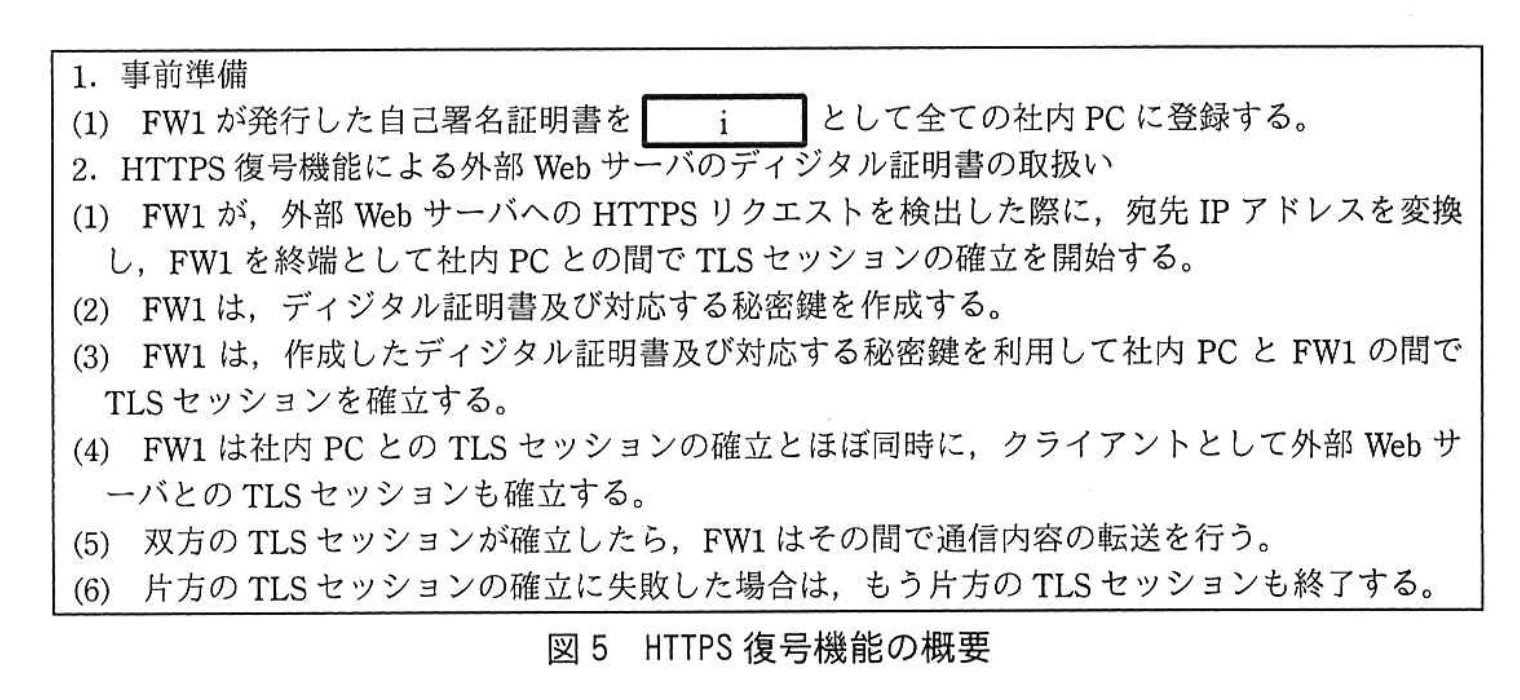 とあり、信頼の対象が“CAのディジタル証明書”であることが示されています。 - よって、i には「信頼するCAのディジタル証明書」と入れることで、FW1 が自己署名した証明書を CA 証明書として登録し、以降 FW1 が動的に発行するサーバ証明書を社内 PC が検証可能になる仕組みを正確に表せます。