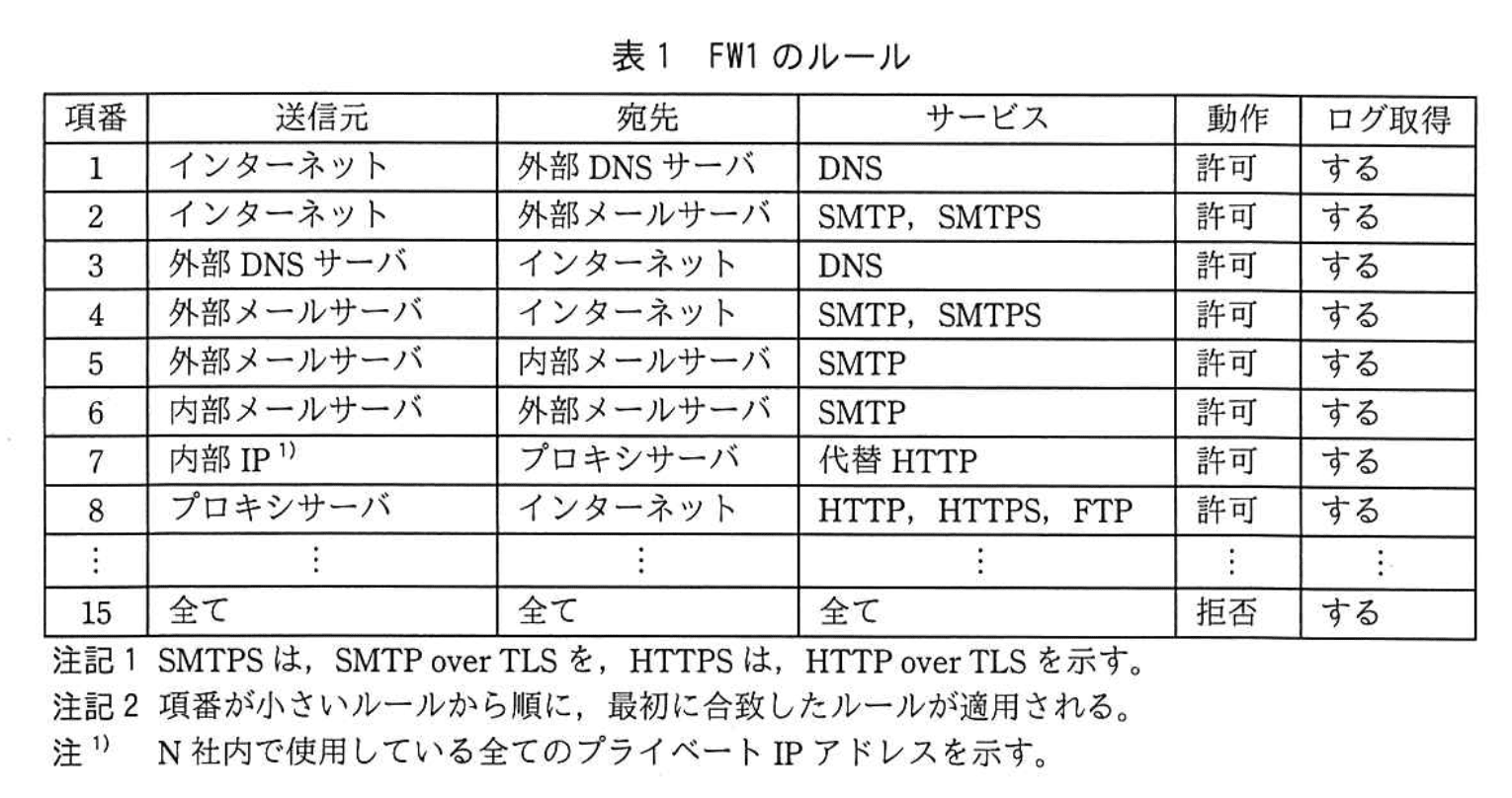 A: FW1 のルール表1“項番7”で “内部 IP¹) → プロキシサーバ:代替 HTTP” が許可されており、逆に直接 Internet への 80/443 通信は最終行“項番15 全て拒否”で遮断されています。したがって外向き Web 系通信は原則プロキシ経由です。