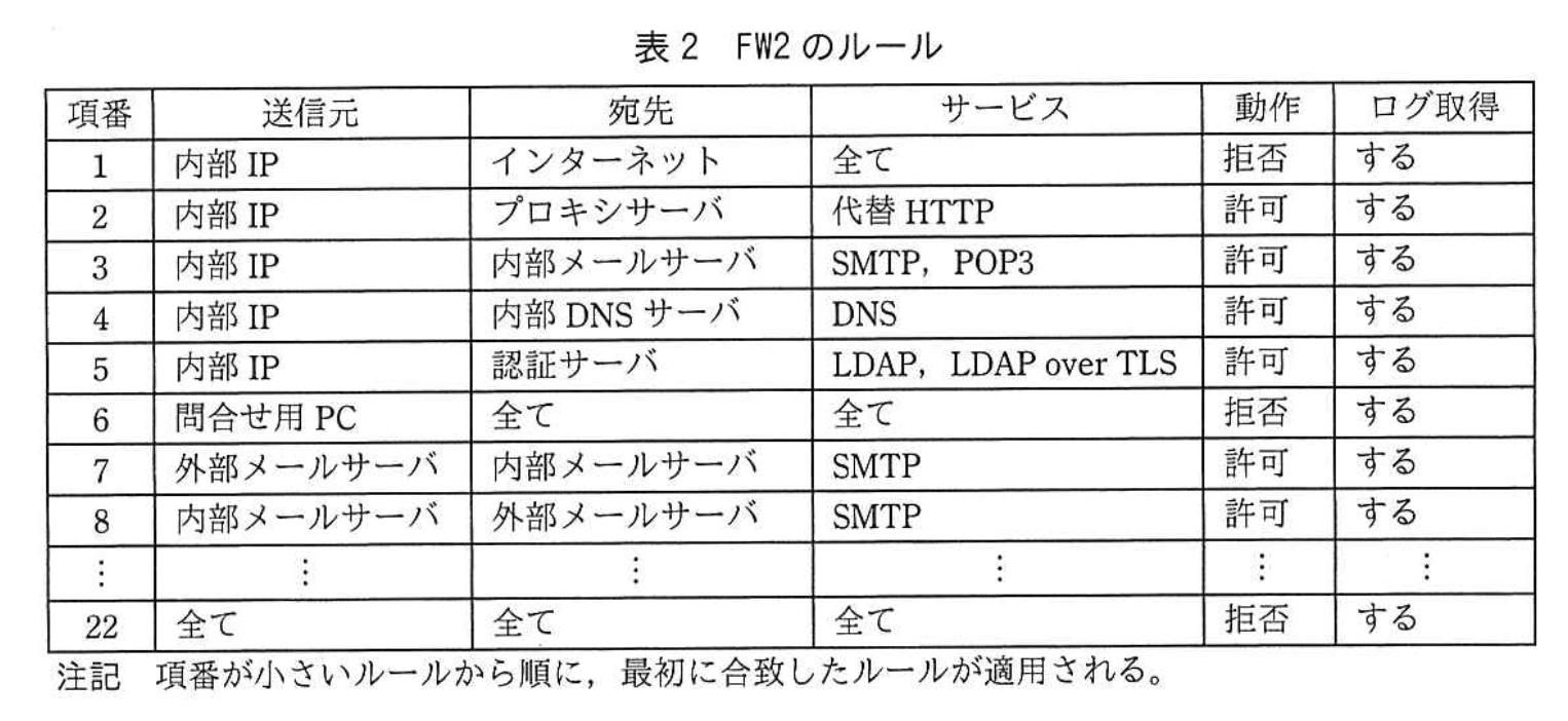 FW1のルールを表1に、FW2のルールを表2に示す。