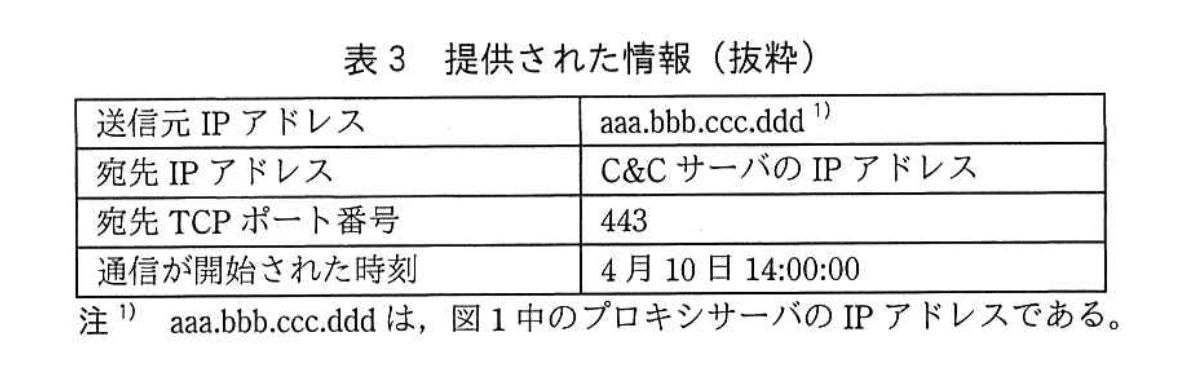 4月12日13:00頃、セキュリティ情報共有団体から、“あるC&C(Command and Control)サーバを調査していたところ、そのサーバに対するN社からの通信記録を発見した。”との連絡が届き、その通信に関して、表3の情報が提供された。