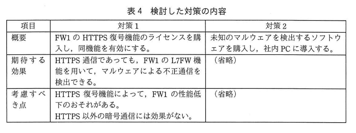 そこで、追加の費用の発生も視野に入れた対策として、W主任は、ライセンスの購入によるHTTPS復号機能の有効化(以下、対策1という)及び社内PCのマルウェア対策の強化(以下、対策2という)の二つを考えた。それぞれの対策の内容は、表4のとおりである。