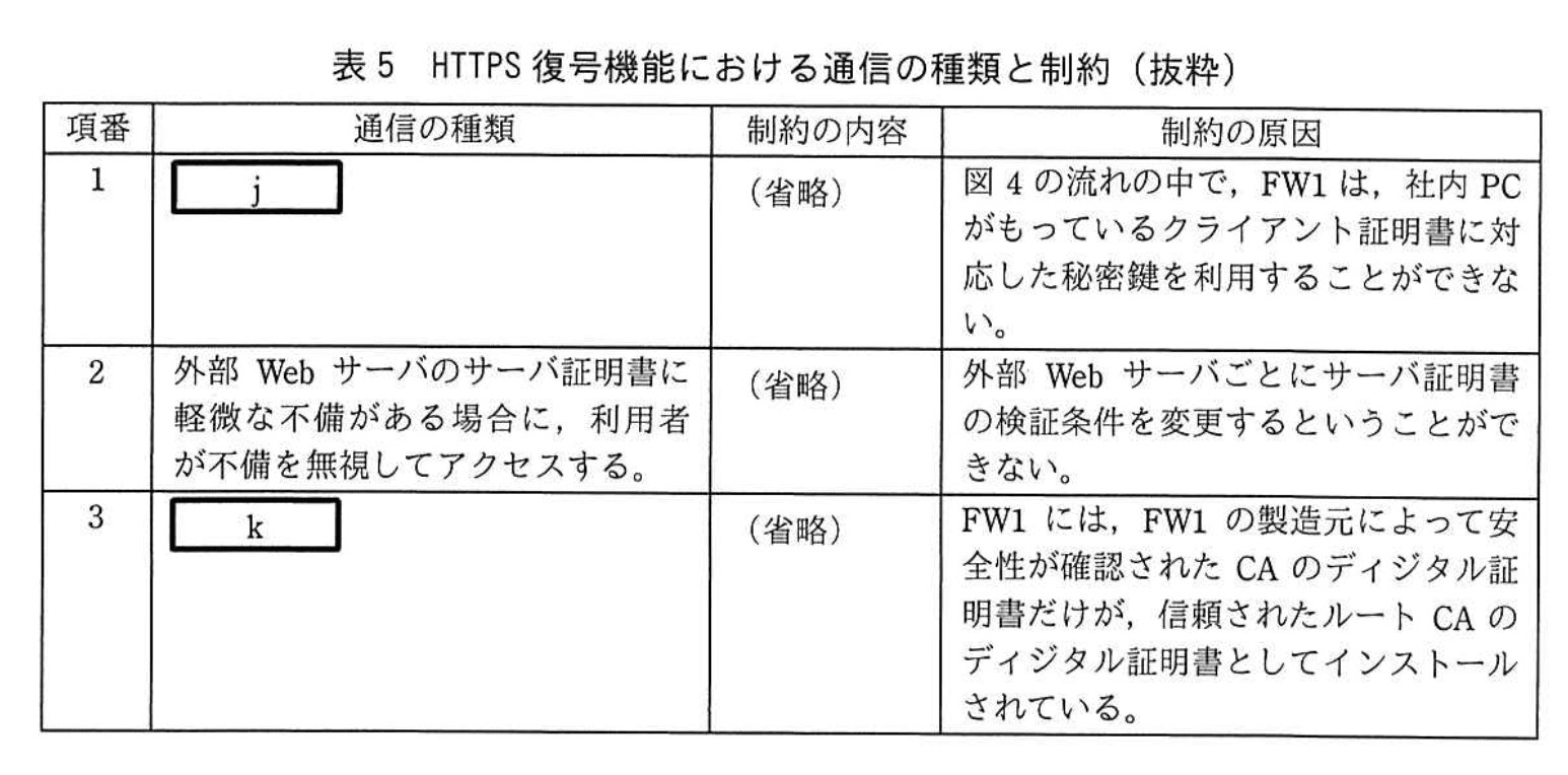 - 表5の項番1には、制約の原因として【問題文】「図4の流れの中で、FW1は、社内PCがもっているクライアント証明書に対応した秘密鍵を利用することができない。」とあります。
