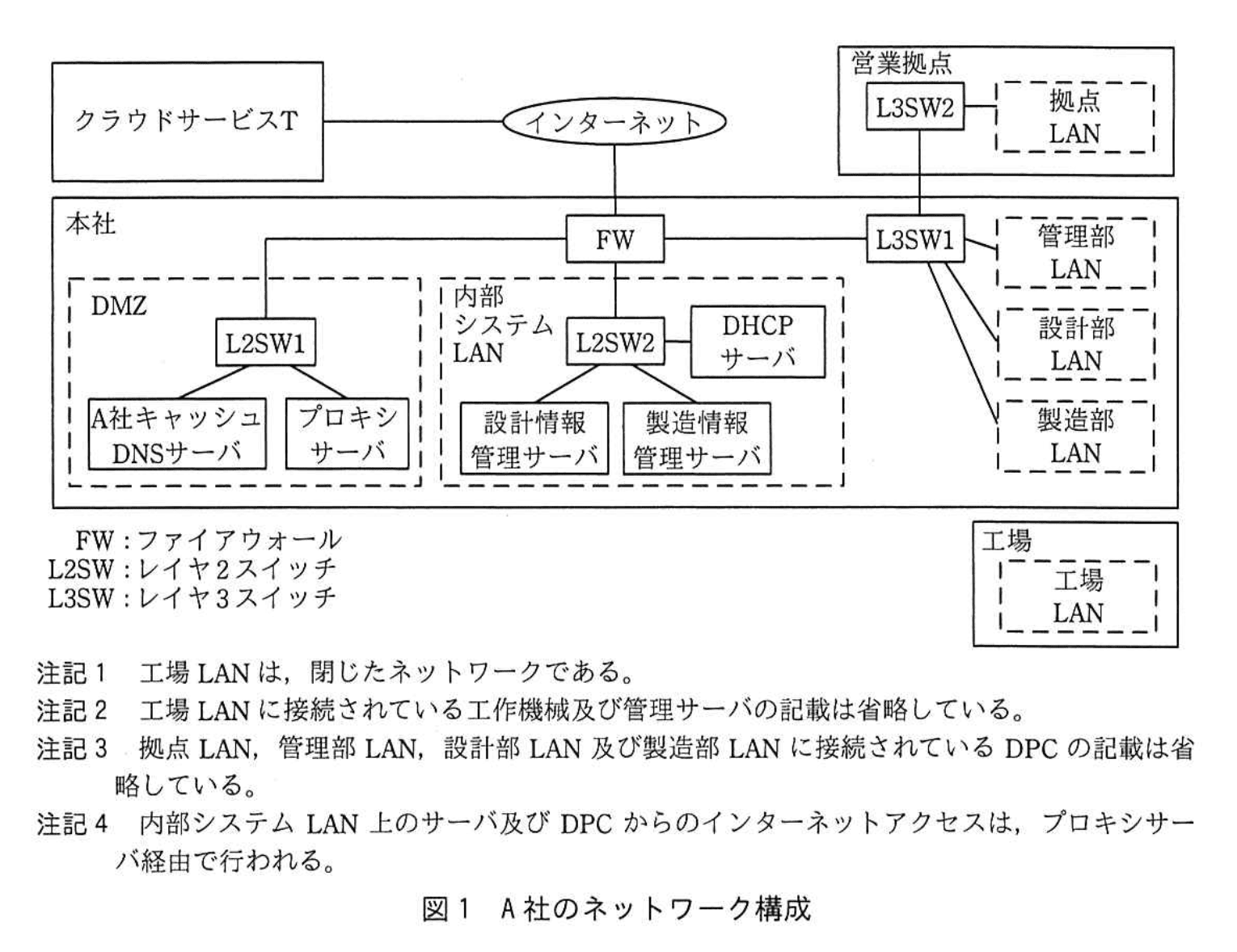 設問2:〔A社のネットワーク構成〕について、(1)、(2)に答えよ。