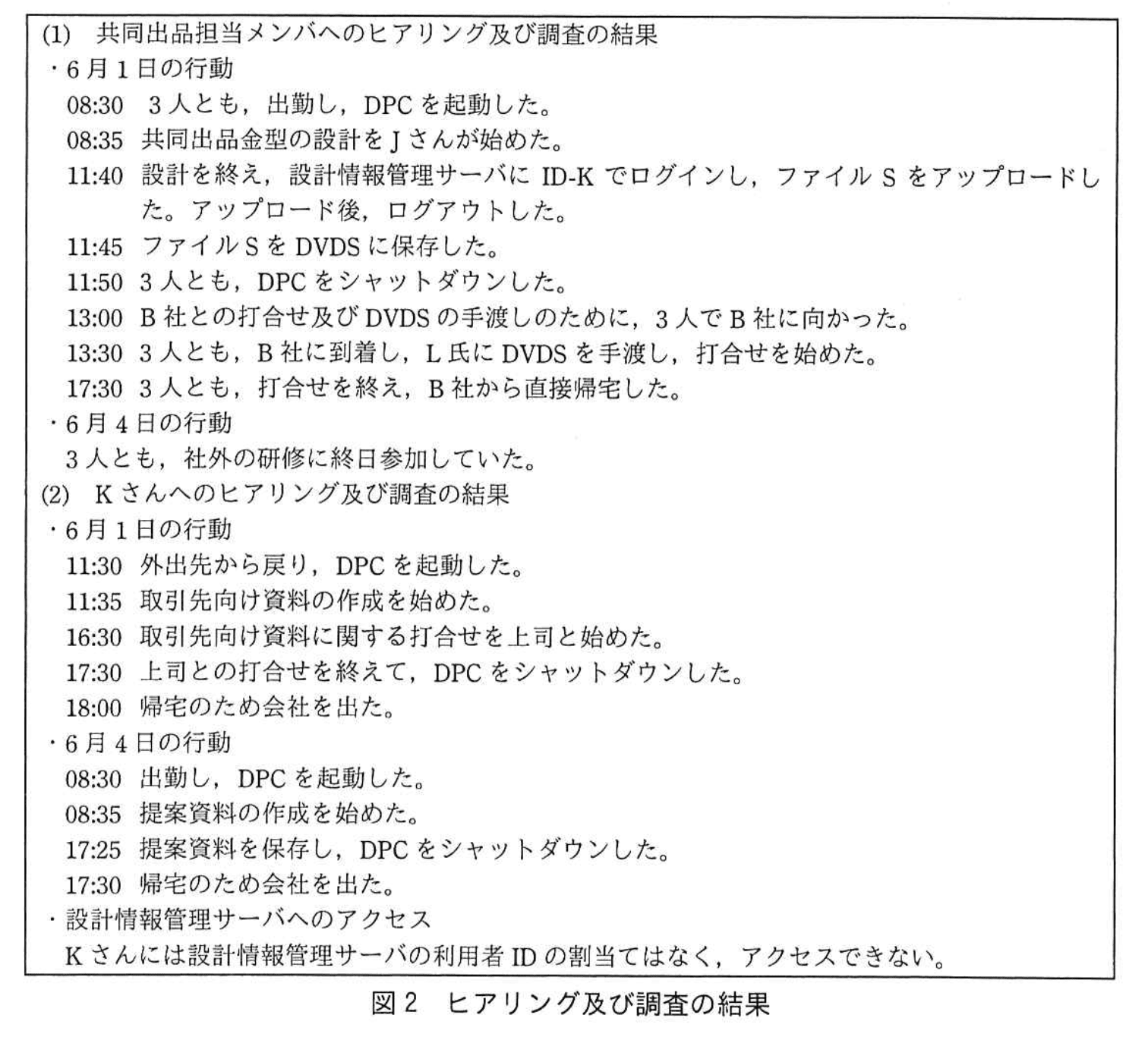 Fさんは、②サーバのログの調査だけでは操作者を特定するには不十分なので、当事者へのヒアリング及びDPCの動作ログの調査が必要であると判断した。ヒアリング及び調査の結果を図2に示す。