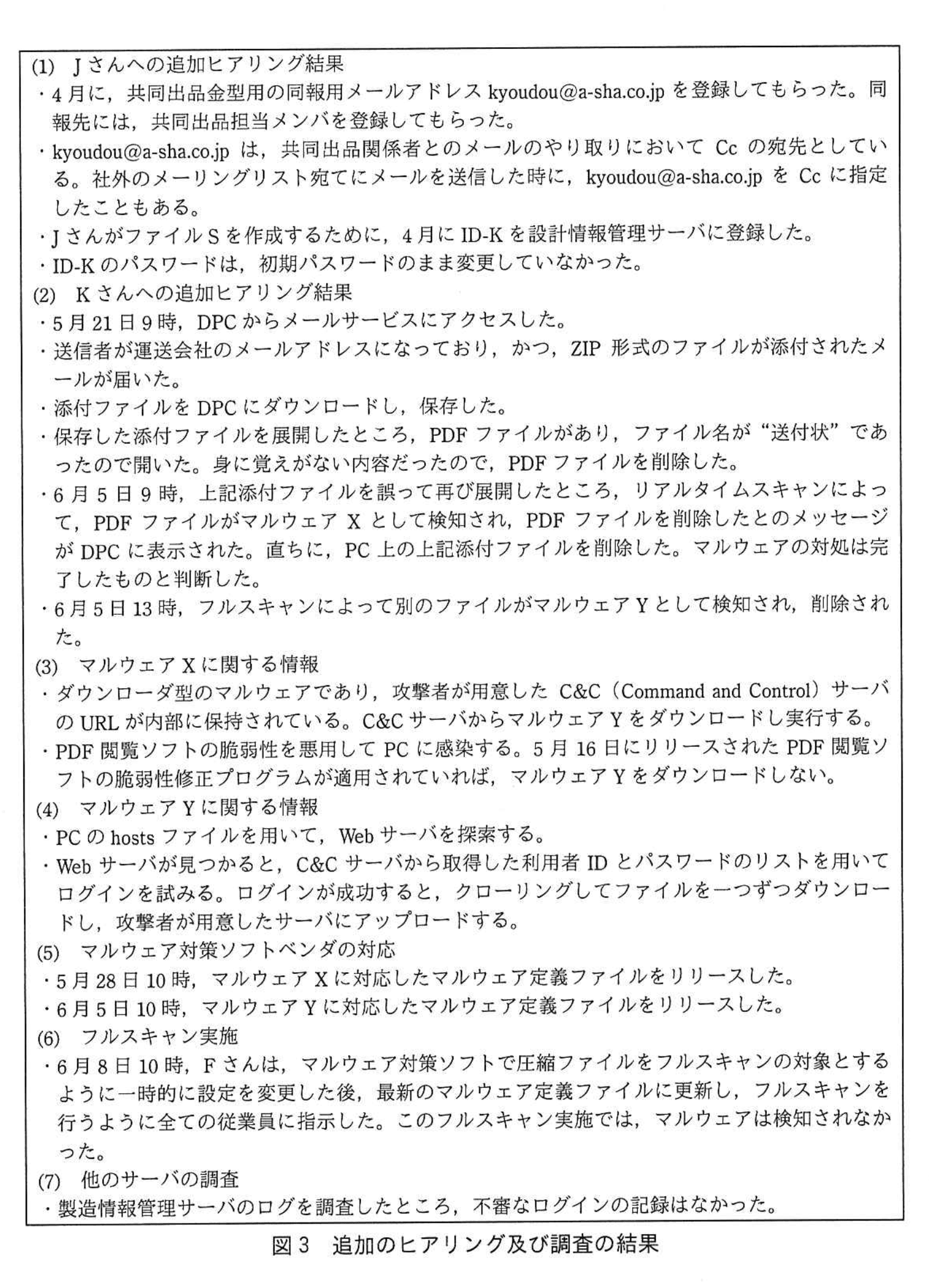 - これを受けて G 氏は「マルウェア対策ソフトでマルウェアが検知されたにもかかわらず、報告がなかったので、A社としての対策がとれなかった」と指摘しています。