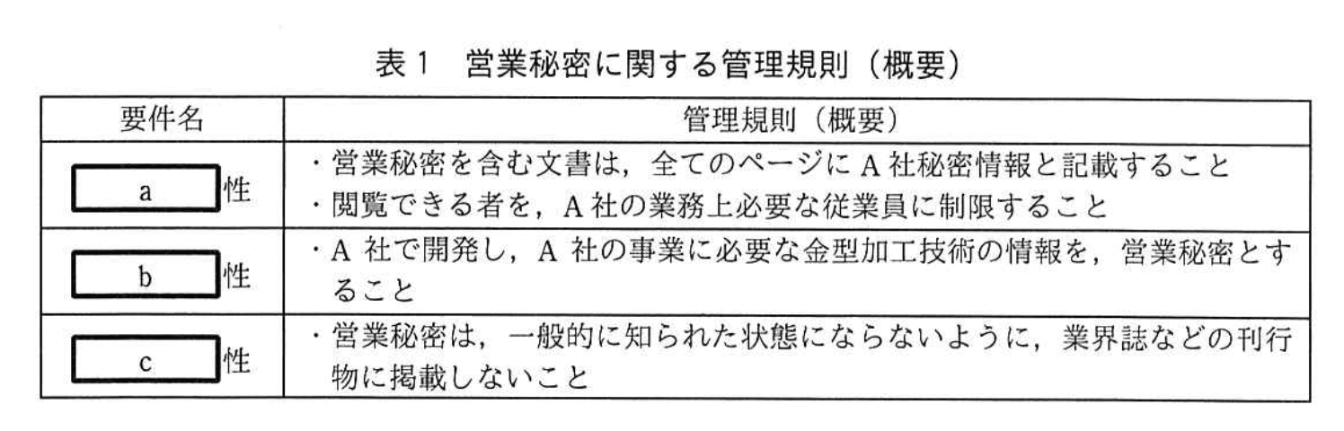 A社では、自社の営業秘密が不正競争防止法で保護されるようにするために、不正競争防止法及び経済産業省が公表している営業秘密管理指針(平成27年1月28日全部改訂)を参考にして、表1に示す営業秘密に関する管理規則を定めている。