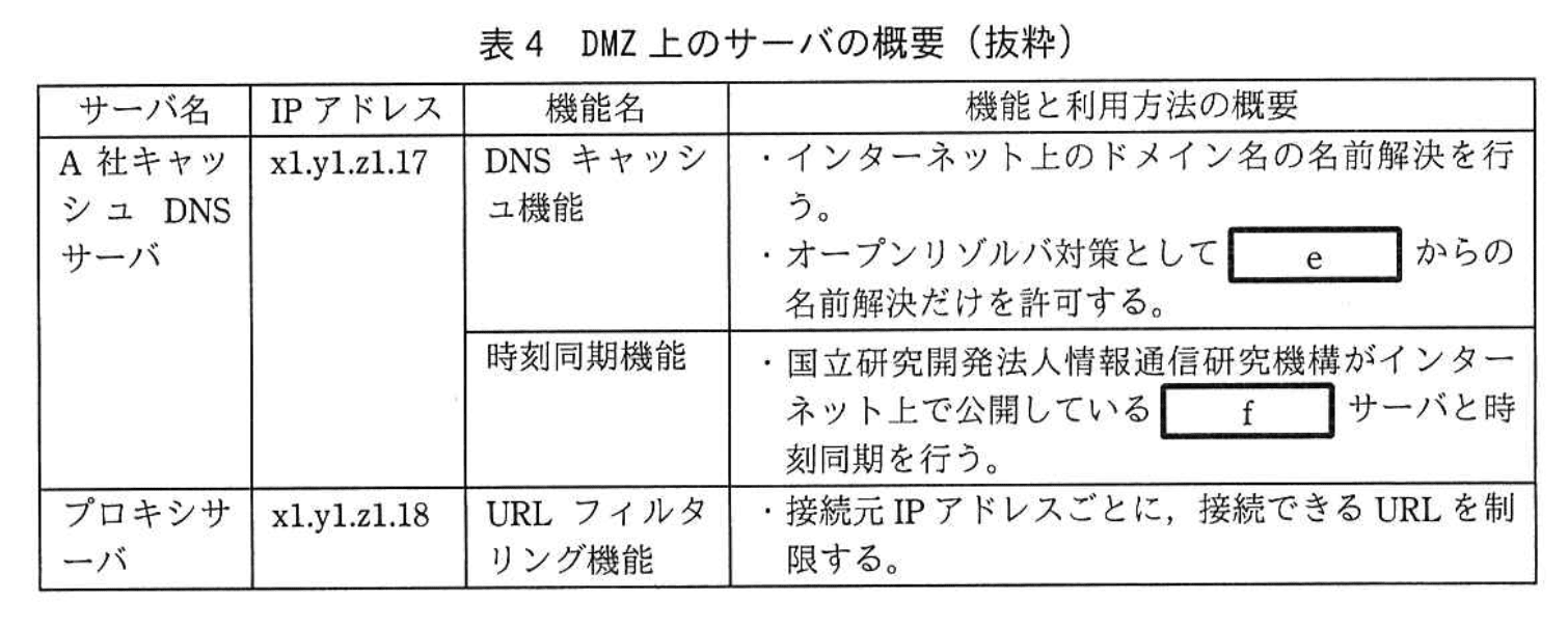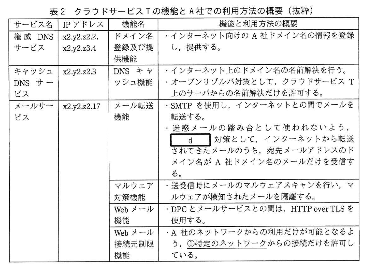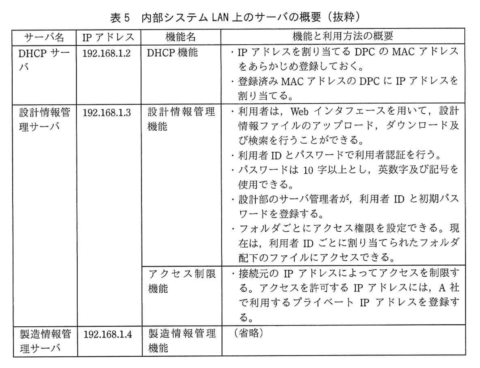 - 表5のアクセス制限機能には「接続元の IP アドレスによってアクセスを制限する。アクセスを許可する IP アドレスには、A社で利用するプライベート IP アドレスを登録する。」とあり、実際には全社のプライベートアドレスが許可されています。