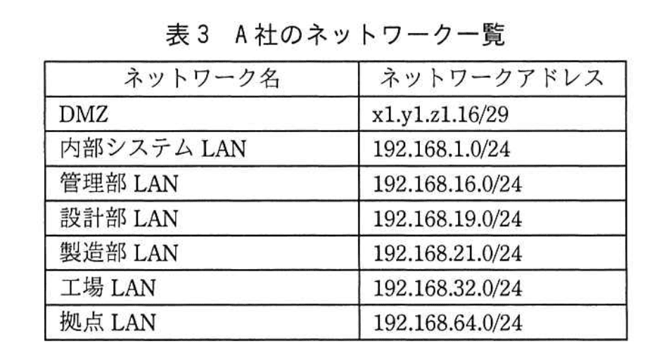 A社のネットワーク構成を図1に、A社のネットワーク一覧を表3に示す。