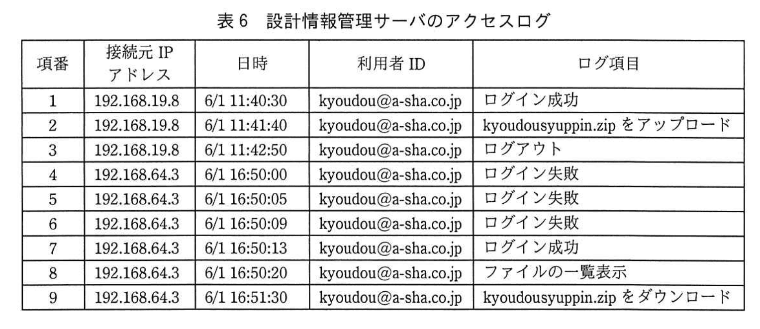 FさんはG氏の協力を受けて、FW, DMZ上のサーバ及び内部システムLAN上のサーバの調査を開始した。FさんとG氏は、設計情報管理サーバからファイルSが取り出された可能性が高いと考え、設計情報管理サーバのアクセスログを調査した。その結果、ファイルSを作成するためにJさんが設計情報管理サーバに登録した利用者ID kyoudou@a-sha.co.jp(以下、ID-Kという)による不審なアクセスが6月1日に発生していたことが判明した。設計情報管理サーバの6月1日のアクセスログのうち、利用者IDがID-Kのものを表6に示す。