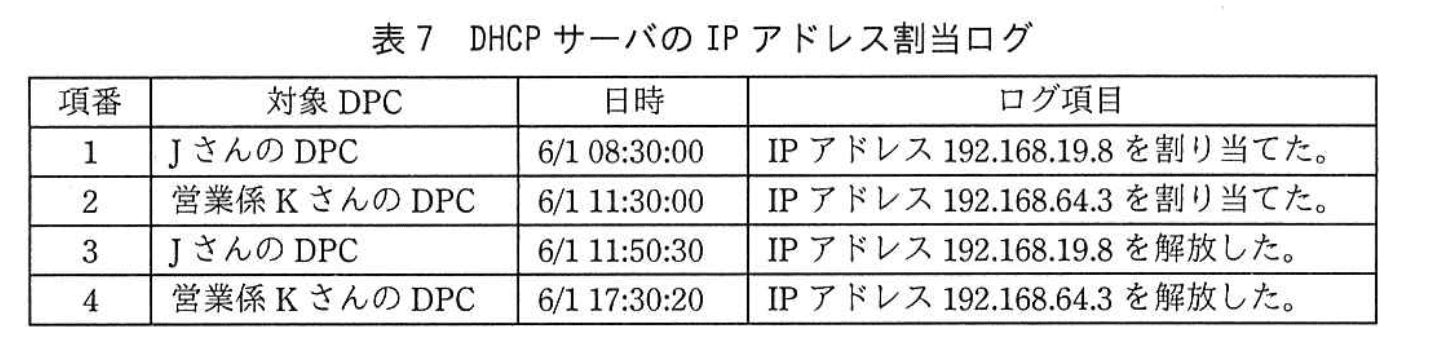 さらに、表6の接続元IPアドレスに記録されたDPCを特定するために、DHCPサーバのログを調査することにした。DHCPサーバの6月1日のIPアドレス割当ログのうち、割り当てたIPアドレスが192.168.19.8又は192.168.64.3であるものを表7に示す。
