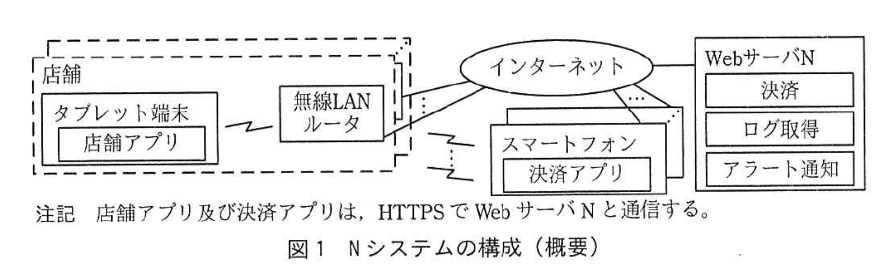Nシステムは、図1に示す構成であり、店舗で店員が利用するタブレット端末用店舗アプリケーションプログラム(以下、店舗アプリという)、利用者が利用するスマートフォン用決済アプリケーションプログラム(以下、決済アプリという)、及び決済、ログ取得、アラート運知などの機能をもつWebサーバNを用いて決済を実現する。