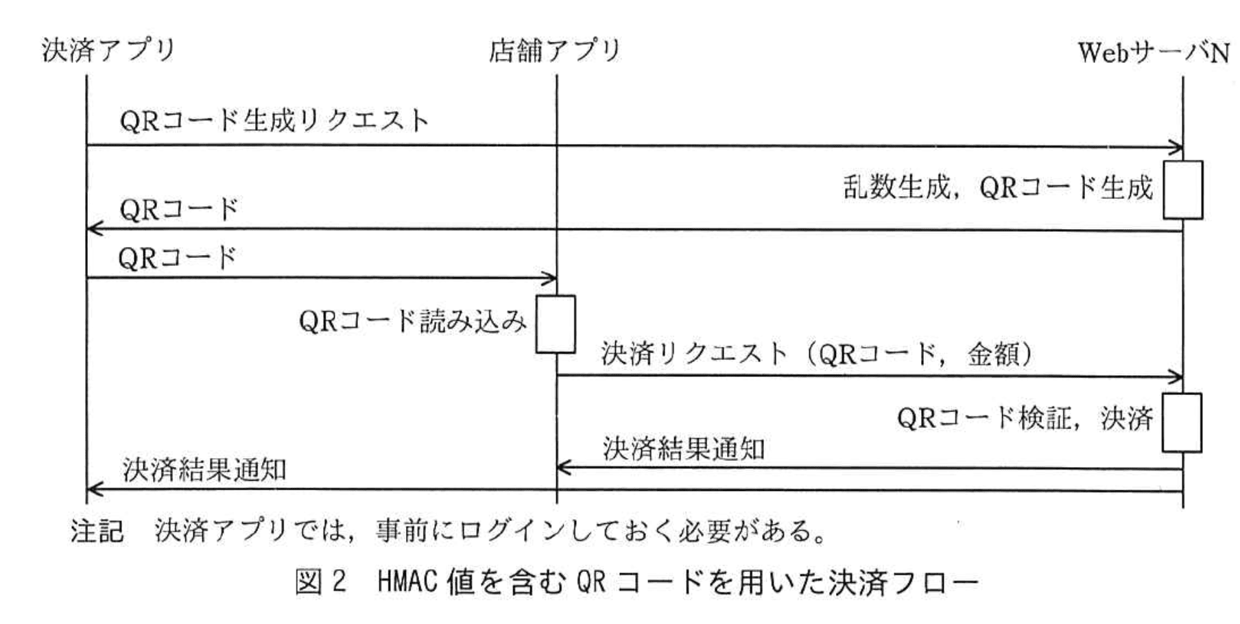Xさんは、表6中の項番1への対策として、メッセージ認証を用いることにした。具体的には、決済機能利用時に決済アプリに表示する情報として、会員番号、WebサーバNで生成した乱数、時刻、及びそれら三つの情報を基に生成されるHMAC(Hash-based Message Authentication Code)値を含めることにした。バーコードで扱える桁数を超えてしまうので、代わりにQRコードを表示することにした。HMAC値を含むQRコードを用いた決済フローを図2に示す。QRコード生成及びQRコード検証の手順を図3に示す。