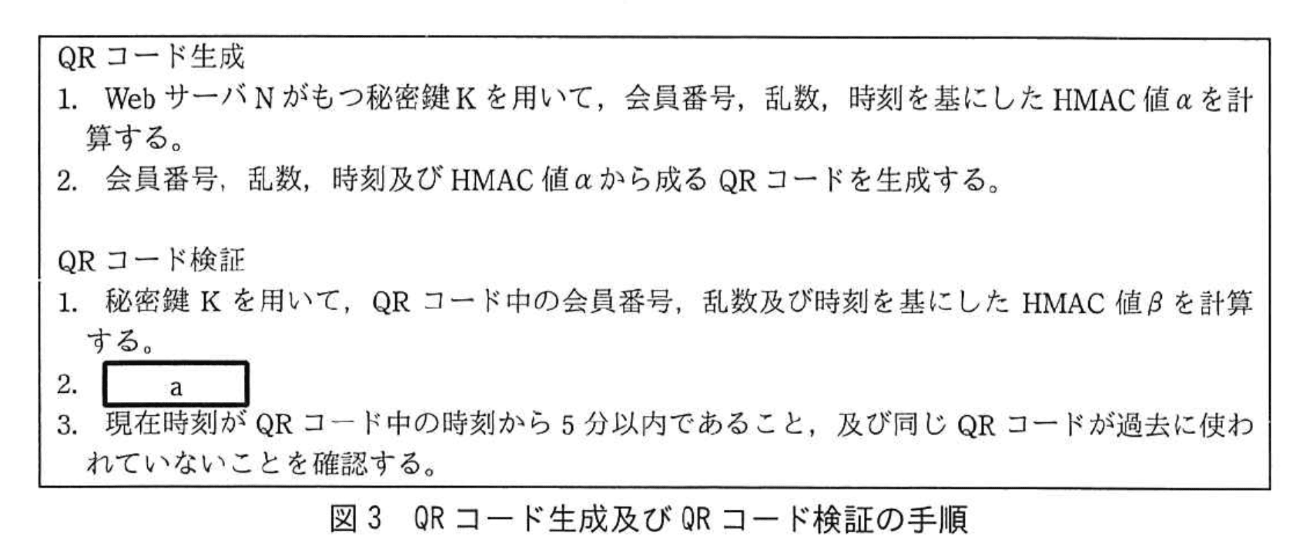 - 〔項番1への対策〕では、「会員番号、WebサーバNで生成した乱数、時刻、及びそれら三つの情報を基に生成されるHMAC(Hash-based Message Authentication Code)値」をQRコードに含めると記載されています。