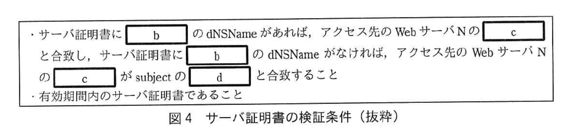 「サーバ証明書に b の dNSName があれば、アクセス先の Web サーバ N の c と合致し、サーバ証明書に b の dNSName がなければ、アクセス先の Web サーバ N の c が subject の d と合致すること」