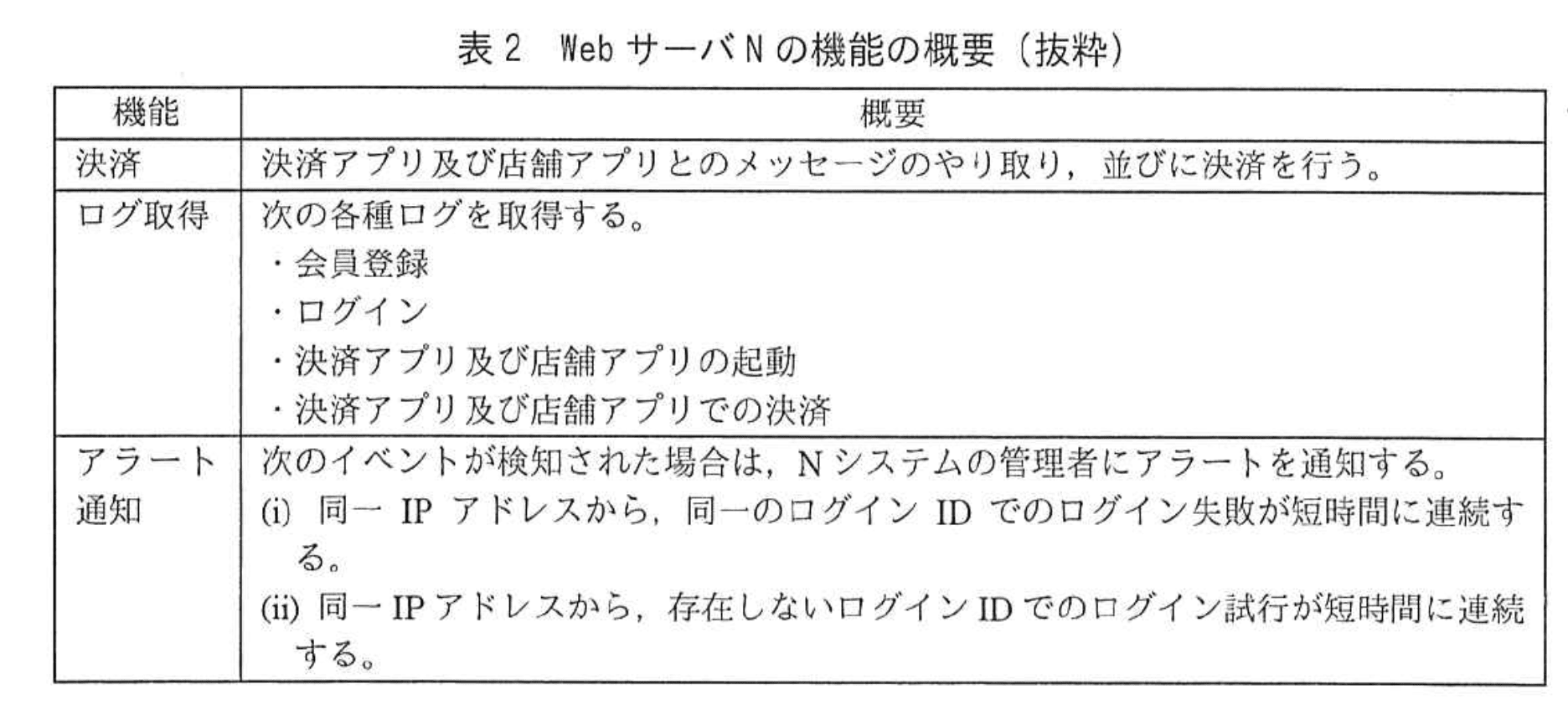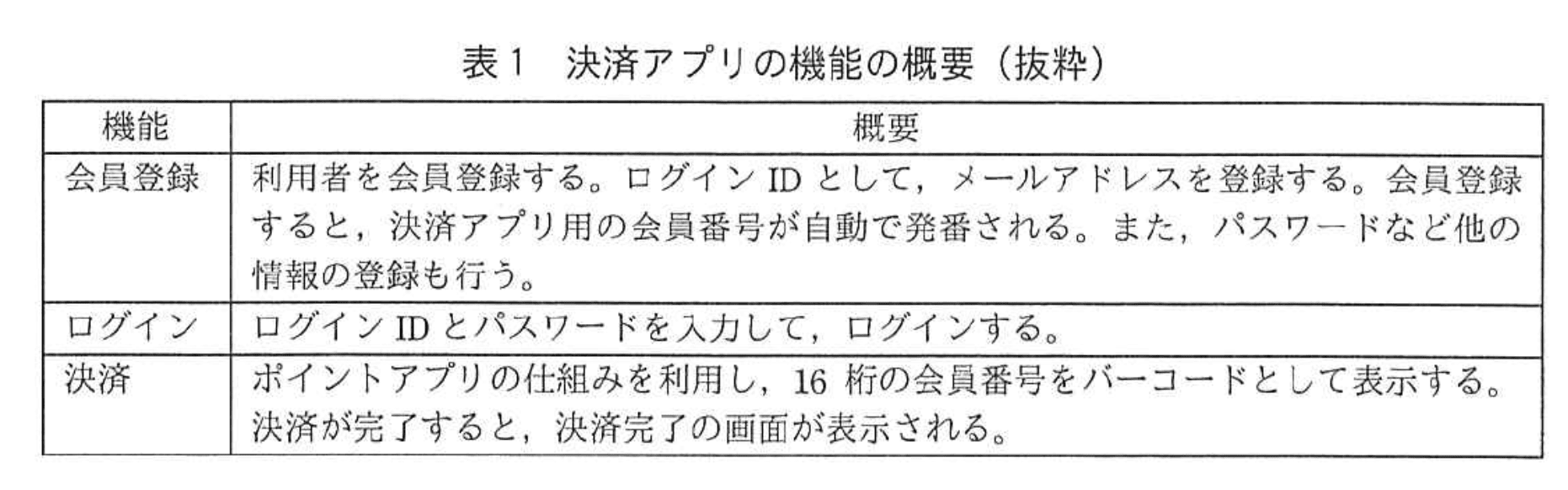 決済アプリの機能の概要を表1に、WebサーバNの機能の概要を表2に、会員登録処理を表3に、決済処理を表4に示す。