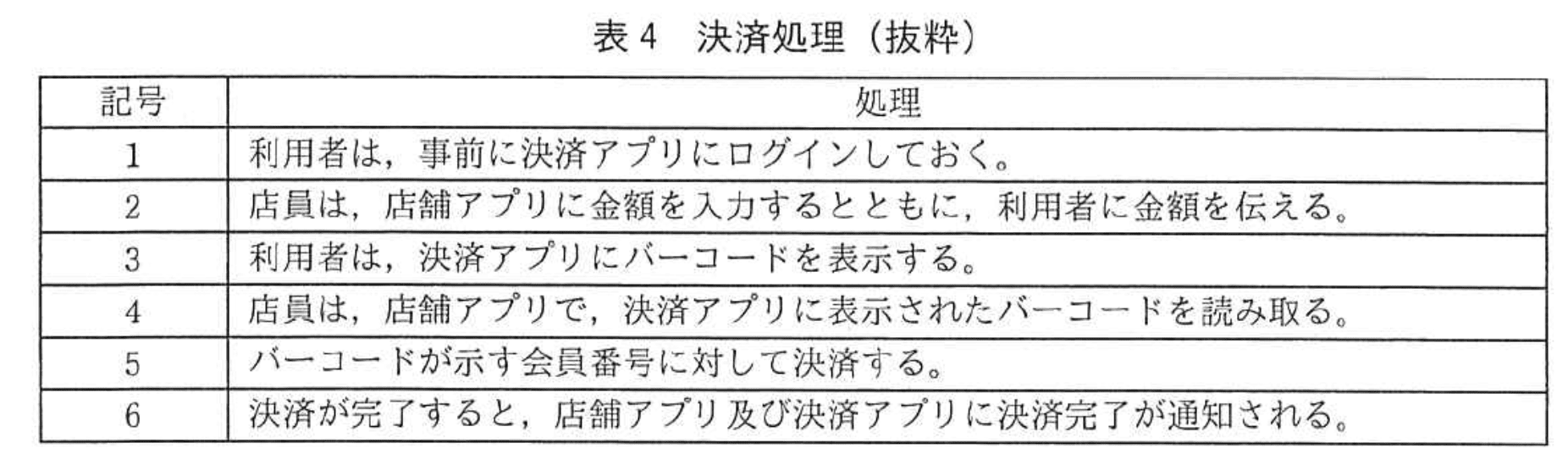 - 表4の決済処理では「3 利用者は,決済アプリにバーコードを表示する。」→「5…バーコードが示す会員番号に対して決済する。」のみで,バーコードが再利用不可能である旨の説明はありません。