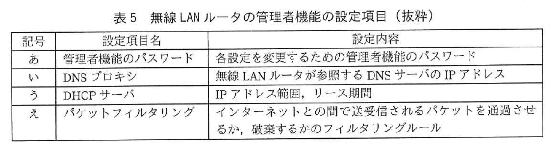 各店舗では、決済時に利用者のスマートフォンが確実に通信できるように、Nシステム導入に合わせて、各店舗に導入済みの無線LANルータをインターネットに接続し、利用者に無線LANサービスを提供する予定である。無線LANルータは全て同一の機種である。各店舗で管理者を決めて、管理者が手動で初期設定をしている。表5に無線LANルータの管理者機能の設定項目を示す。