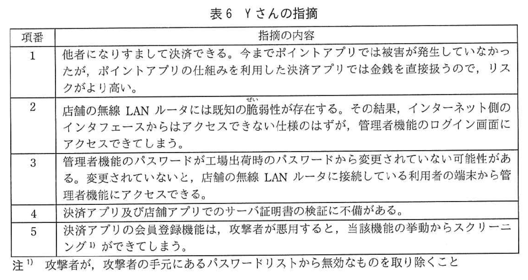- 表6の指摘5には「決済アプリの会員登録機能は、攻撃者が悪用すると、当該機能の挙動からスクリーングができてしまう。」とあります。