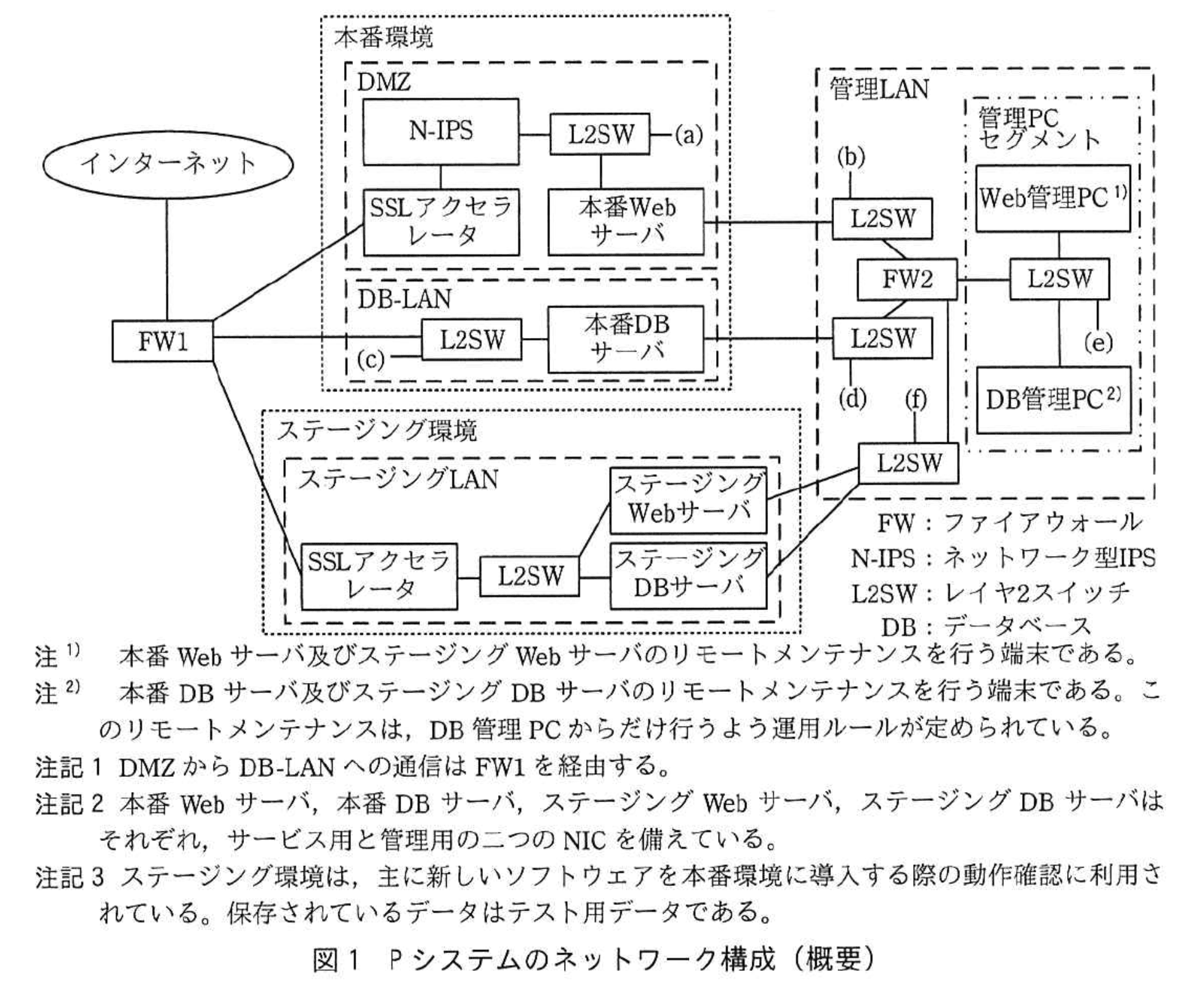 この提案について、運用グループから説明があった。運用グループによれば、最近配属された担当者が、Web管理PCから本番DBサーバにログインを試みた。その結果、警告灯が点灯し、運用グループは緊急対応体制をとることになってしまった。その再発防止策の一つとして、FW2のルールを修正し、c宛ての通信については、dからの通信だけをeすることにした。その影響で、接続ポイントの変更が必要になるとのことだった。