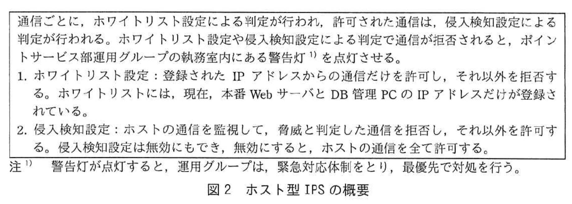 「ホワイトリスト設定や侵入検知設定による判定で通信が拒否されると、ポイントサービス部運用グループの執務室内にある警告灯¹)を点灯させる。」