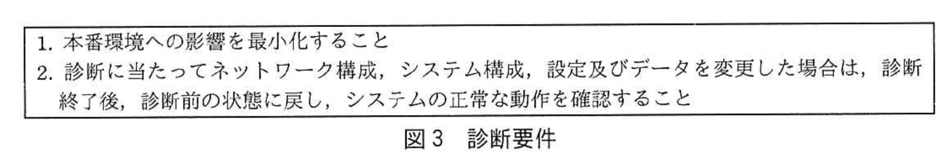 - 図3に示された診断要件2「診断に当たってネットワーク構成、システム構成、設定及びデータを変更した場合は、診断終了後、診断前の状態に戻し、システムの正常な動作を確認すること」との整合を取るためには、診断終了後に作成した「診断用の利用者ID」を削除する必要があります。