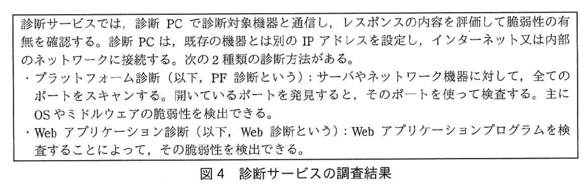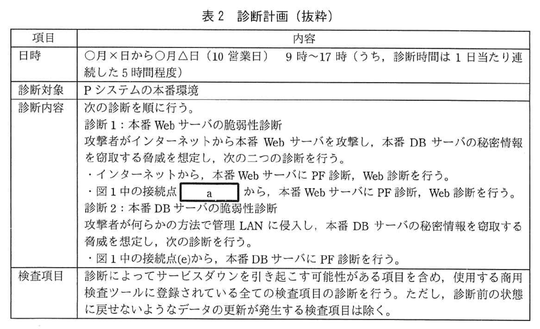 診断計画では「図1中の接続点(e)から、本番DBサーバにPF診断を行う。」とある。PF診断は全ポートをスキャンするため、ホスト型IPSが“脅威”と誤判定して通信を拒否する可能性が高い。 -