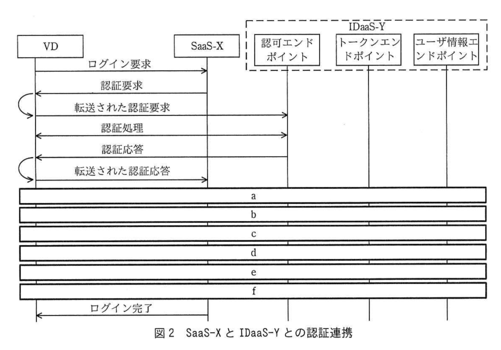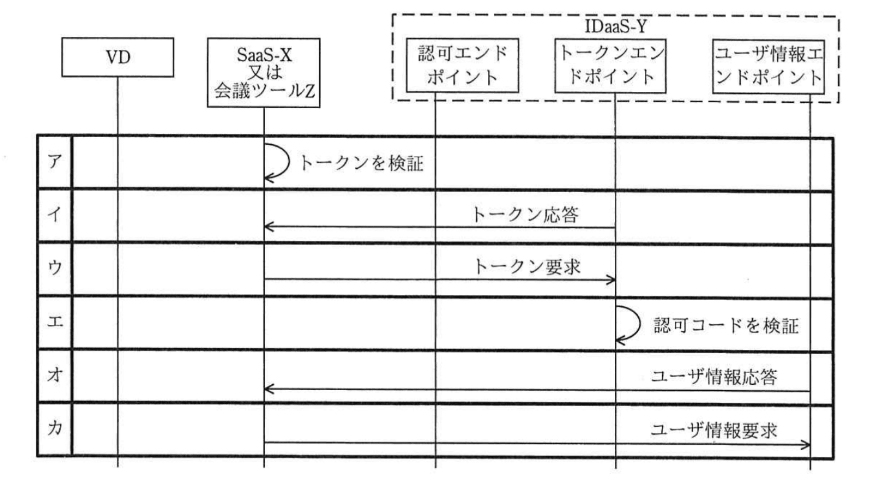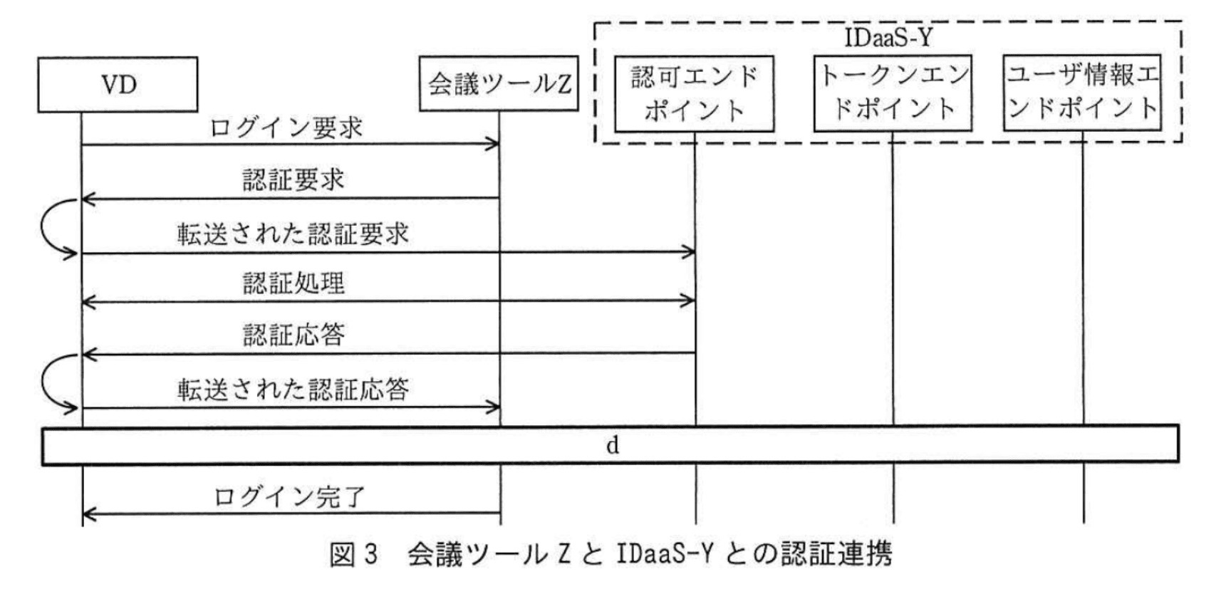 次に、IDaaS-Yと各クラウドサービス間の認証連携について検討した。ノートPCからVDへアクセスする際の、VDとIDaaS-Yとの認証連携は、RADIUSで行うことにした。VDからSaaS-Xにアクセスする際の、SaaS-XとIDaaS-Yとの認証連携は、図2のようにOpenID Connectの認可コードフローでこれまでと同様に行うことにした。VDから会議ツールZにアクセスする際の、会議ツールZとIDaaS-Yとの認証連携は、図3のようにImplicitフローで行うことにした。