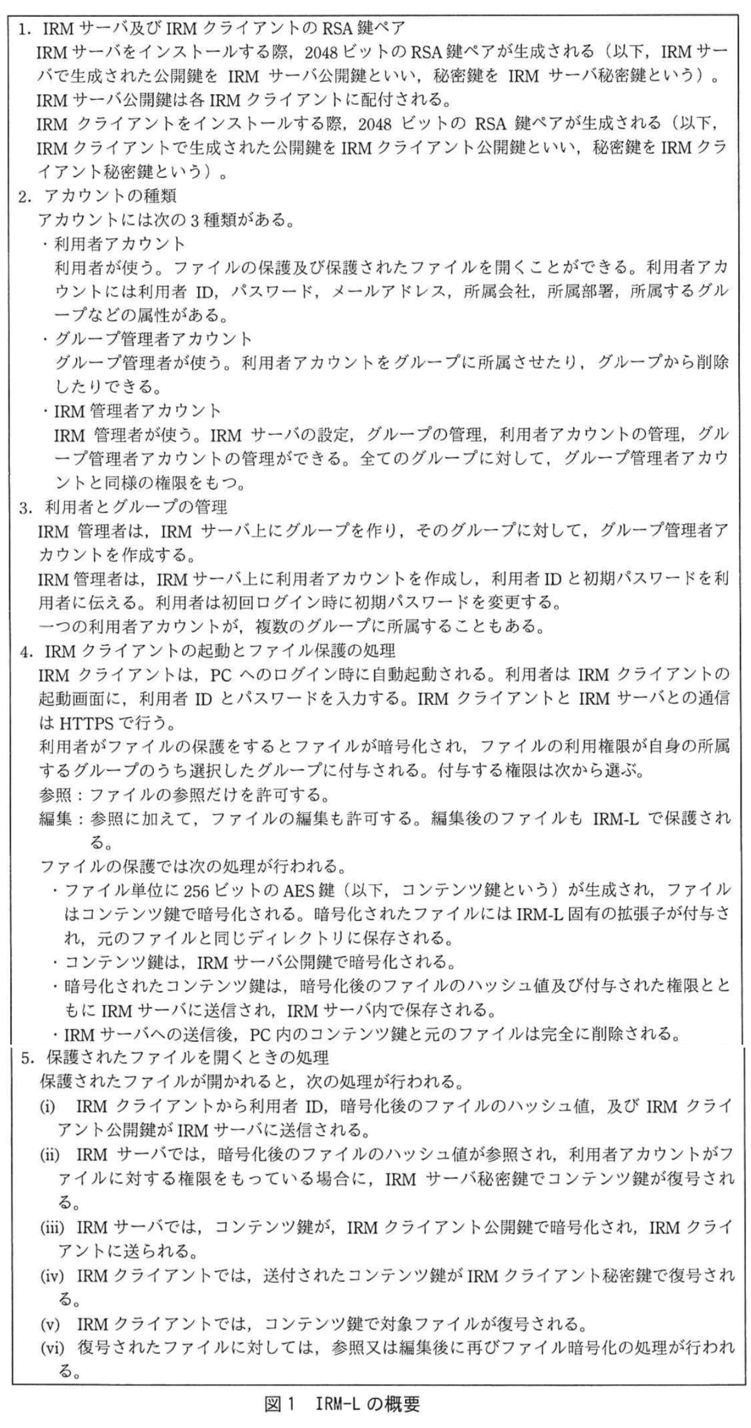Z主任は、導入実績の豊富なL社のIRM製品(以下、IRM-Lという)によって表1中の問題が解決できるかどうかを確認することにした。IRM-Lは、複数の利用者から成るグループ単位にアクセス権限の付与ができる。IRM-LはIRMクライアントとIRMサーバから構成される。IRMクライアントは、PCにインストールされ、ファイルの暗号化及び復号を行う。IRMサーバは、IRMクライアントの管理を行う。IRM-Lの概要を図1に示す。