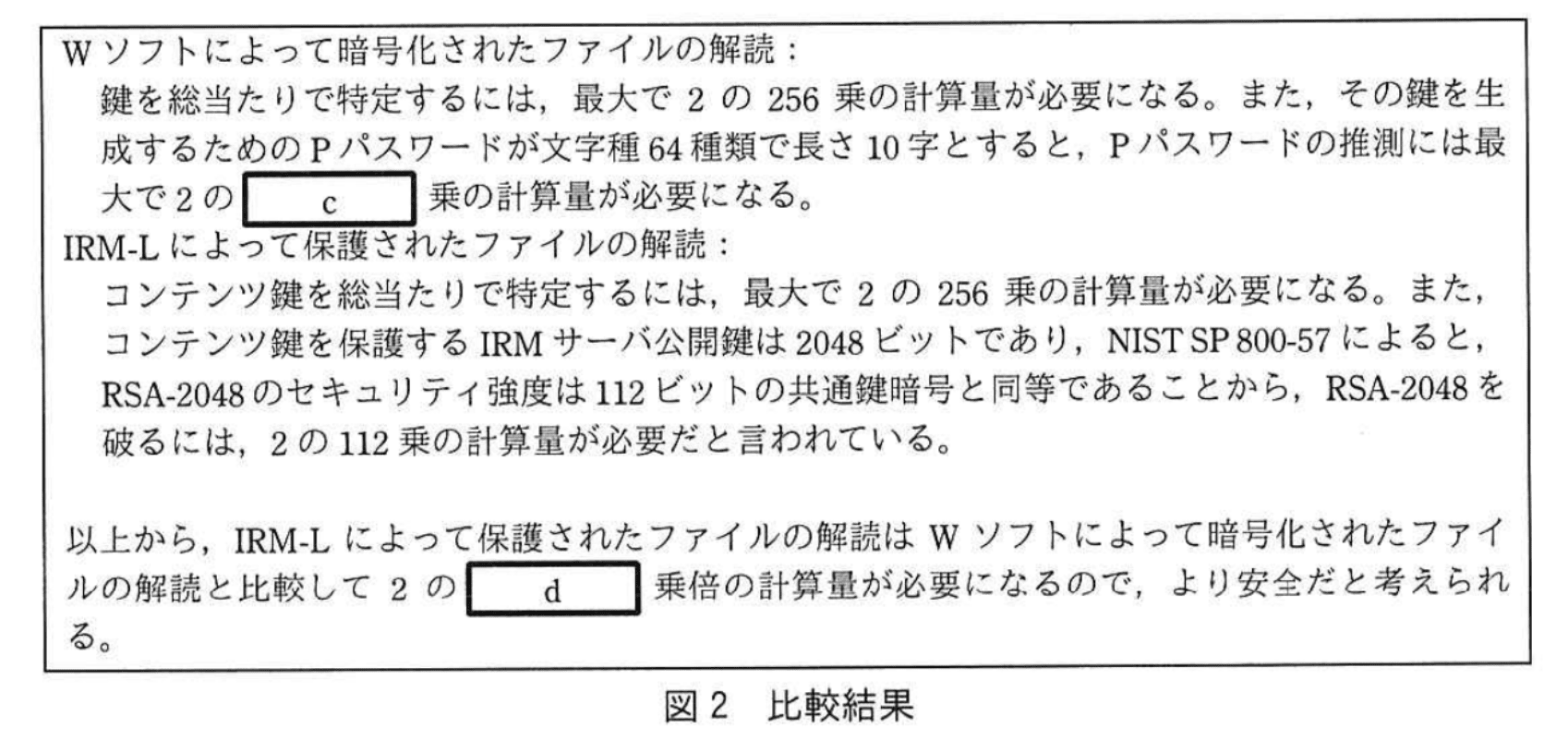 さらに、“IRM-Lによって保護されたファイルの解読はWソフトによって暗号化されたファイルの解読と比較して2のd乗倍の計算量が必要になる” とあります。