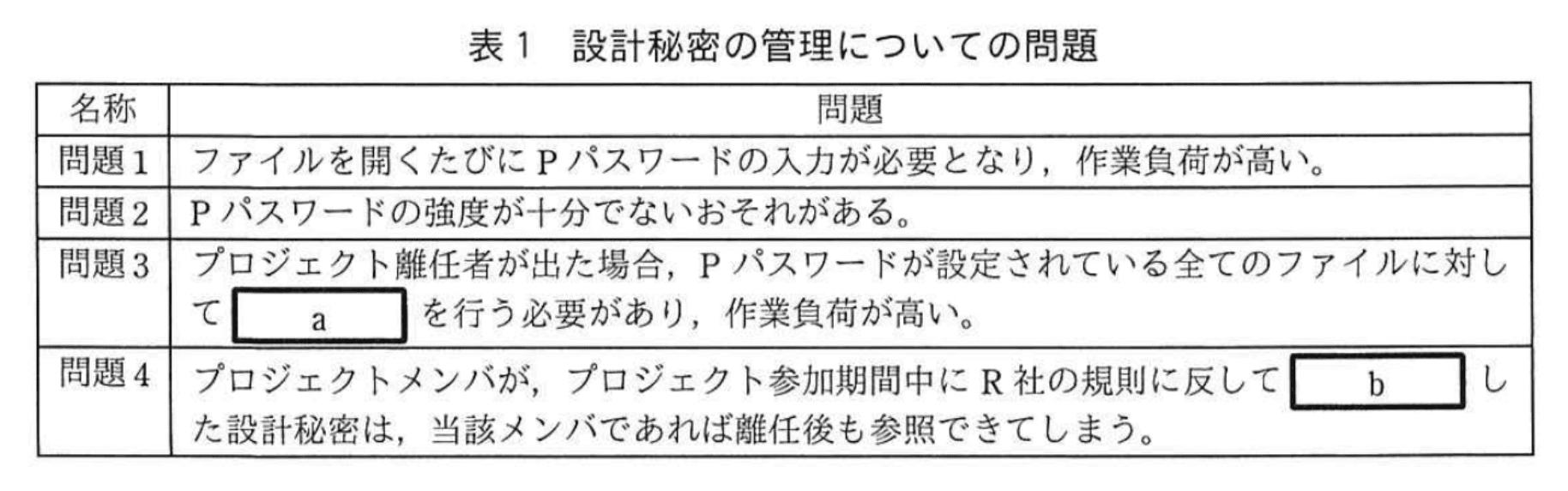 プロジェクト離任者に閲覧させないためには、ファイルごとに設定した「Pパスワード」を刷新する以外の手段がありません。したがって a は「Pパスワードの変更」になります。 - 同じく表1には次の記述があります。