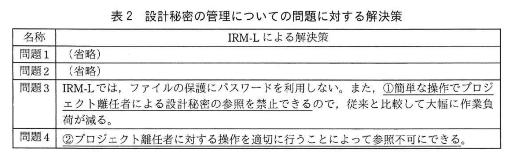 - 表2の下線①は「簡単な操作でプロジェクト離任者による設計秘密の参照を禁止できるので」と記述されています。