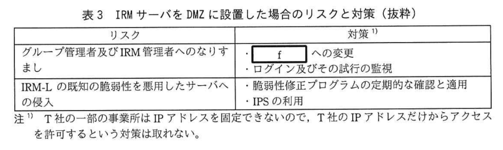 T社ネットワークからIRMサーバにアクセスするには、IRMサーバをR社のDMSに設置し、インターネットからアクセス可能にする必要がある。Z主任は、IRMサーバをDMZに設置した場合のリスクと対策を表3のとおりまとめた。