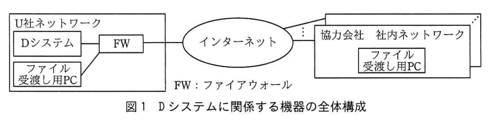 U社は、従業員10,000名の半導体製造業であり、国内に工場を置いている。U社では、幾つかの工程を国内の40社の協力会社に委託しており、生産計画や設計書類のファイルを協力会社との間で受け渡す必要がある。ファイルの受渡し件数は、協力会社によって異なるが、1日当たり1件から10件である。U社では、生産管理課が協力会社とのファイルの受渡しを担当している。ファイルの受渡しには、Webベースのファイル交換システム(以下、Dシステムという)を使用している。Dシステムは、HTTPサーバ及びU社が開発したWebアプリケーションプログラム(以下、Uアプリという)から成る。Dシステムでは受発注に関するファイルは取り扱っていない。