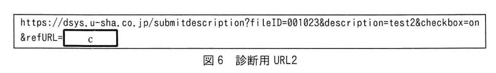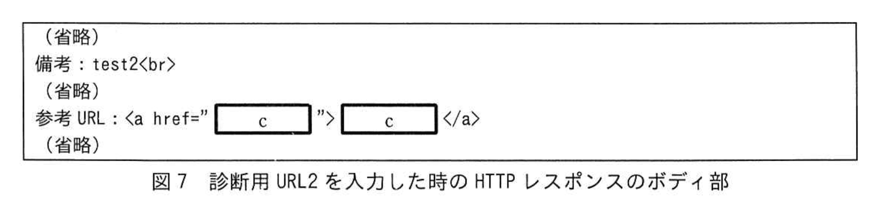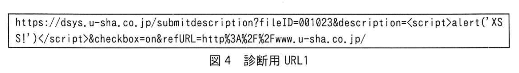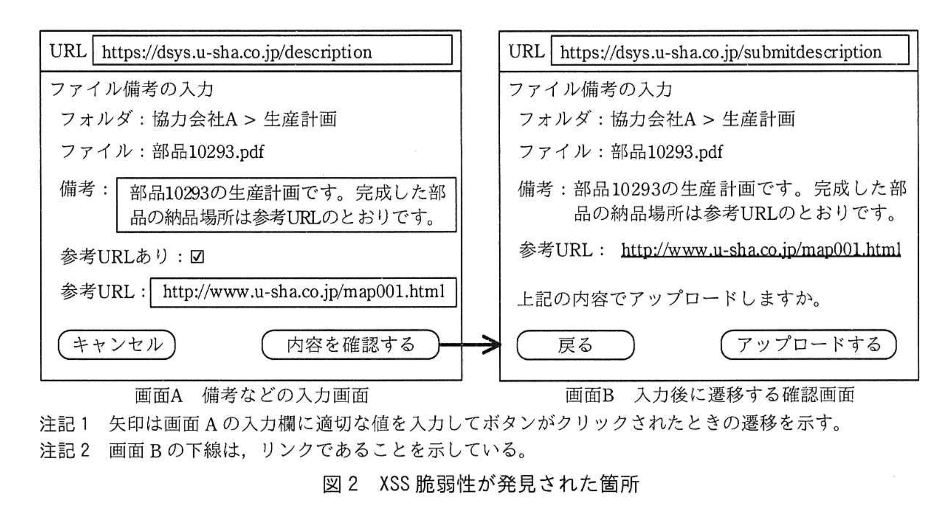 診断の結果、クロスサイトスクリプティング(以下、XSSという)脆弱性などが発見された。XSS脆弱性が発見された箇所を、図2に示す。