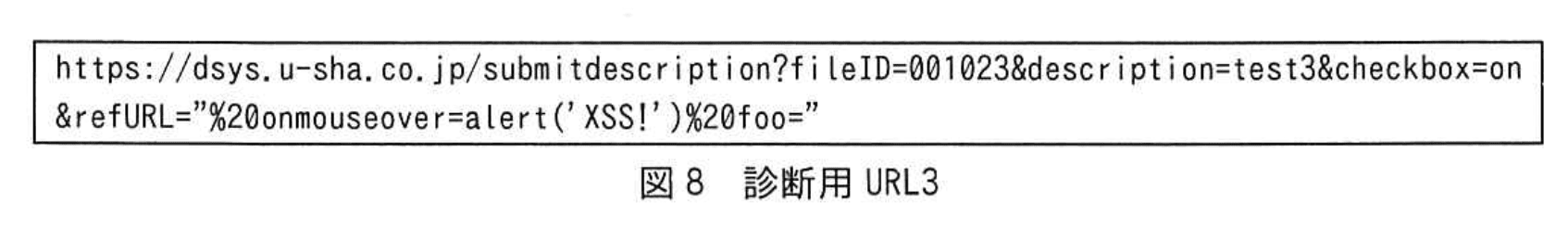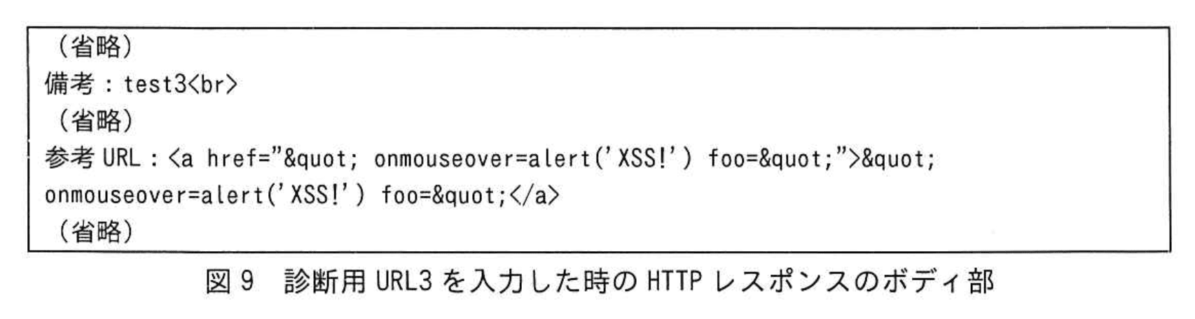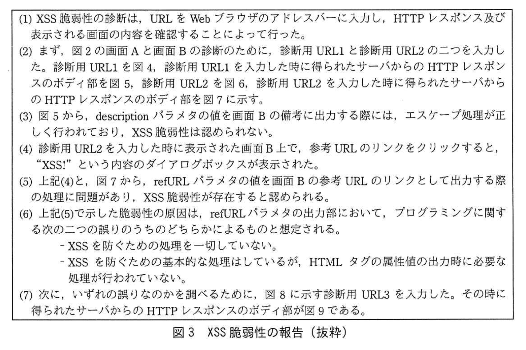 - 図3の報告(3)には「descriptionパラメタの値を画面Bの備考に出力する際には、エスケープ処理が正しく行われており、XSS脆弱性は認められない。」と記載されています。