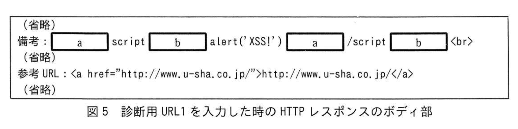 の2つです。どちらも4文字で構成されます。 - 図5の該当箇所は「備考: ascriptbalert('XSS!')a/scriptb」という書式で示され、script と /script の前後に4文字のエスケープシーケンスが入ることが想定されています。