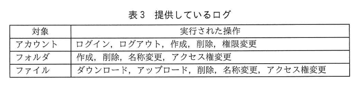 ログには、操作対象、実行された操作とともに、日付、時刻、実行した利用者ID、アクセス元IPアドレス、及び結果(成功又は失敗)が記録される。