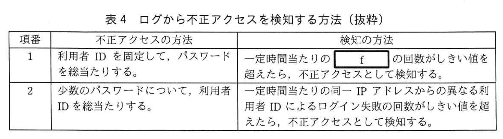 「表4 項番1 不正アクセスの方法:『利用者IDを固定して、パスワードを総当たりする。』」