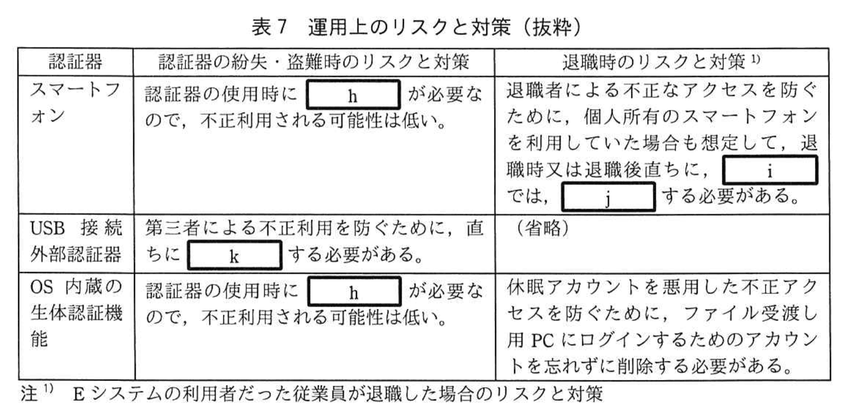 さらに不正アクセス防止の具体的操作は “利用を完全に断つ” こと、すなわち アカウントを削除 です。よって j=アカウントを削除。 - USB 接続外部認証器の行には “第三者による不正利用を防ぐために、直ちにkする必要がある。” と記されています。不正利用を防ぐ最速手段はアカウントを使えない状態にすることなので k=アカウントを無効に が妥当です。