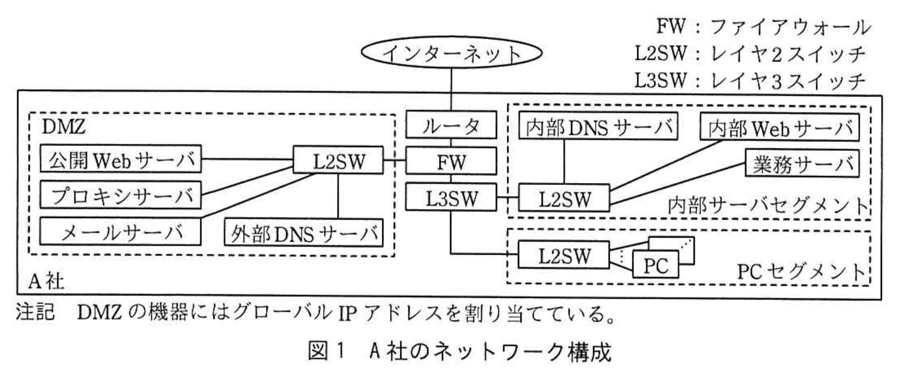 A社は、従業員500名の中規模の小売業であり、インターネットを介して消費者向けに商品を宣伝している。A社のネットワークは、同社の情報システム部(以下、情シ部という)のL部長とM主任を含む7名で運用している。A社のネットワーク構成を図1に、図1中の主な機器とその概要を表1に示す。