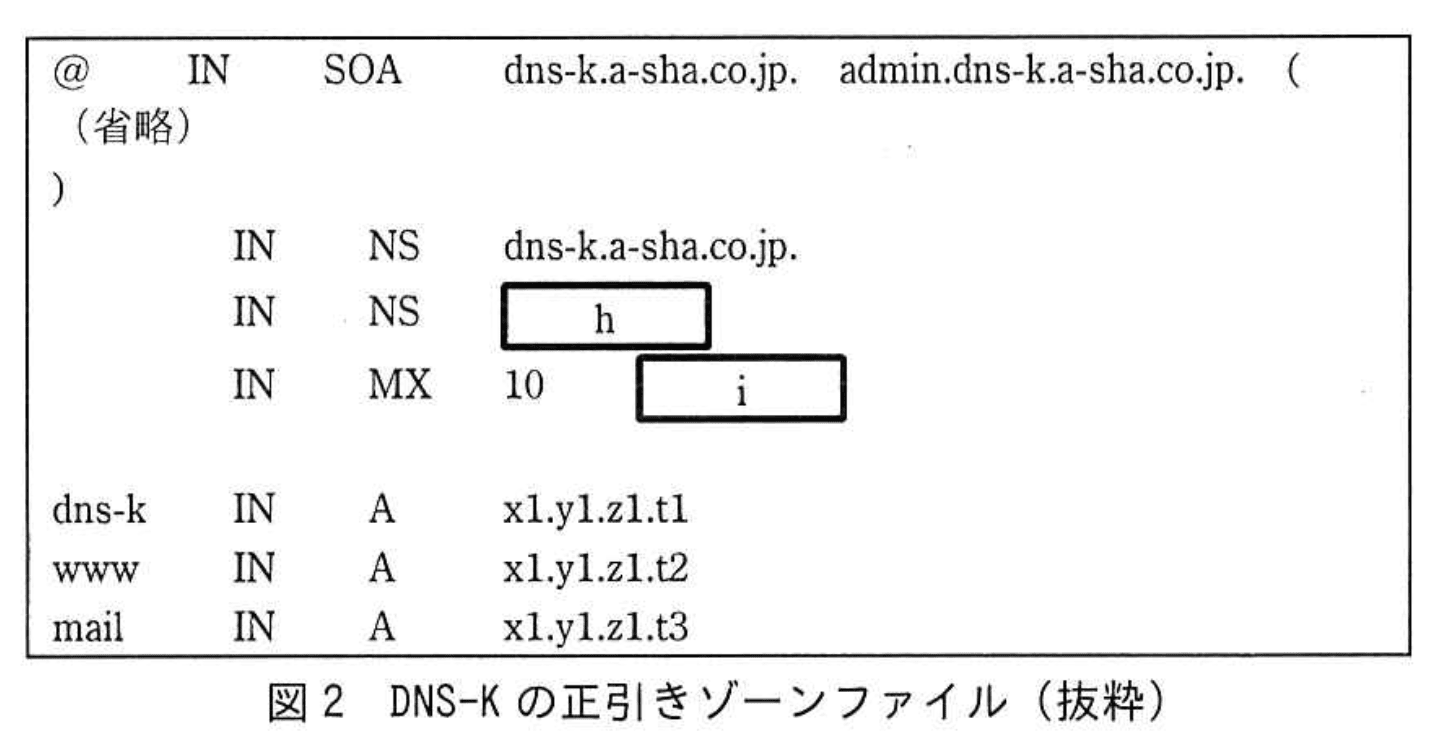 一つ目の案は、外部DNSサーバを廃止した上で、DNS-KとDNS-FというDNSサーバをDMZ上に、DNS-SというDNSサーバをX社のホスティングサービス上に新設し、③プライマリの権威DNSサーバの機能をDNS-Kに、セカンダリの権威DNSサーバの機能をDNS-Sに移行し、フルサービスリゾルバの機能をDNS-Fに移行するものである。M主任は、DNS-KとDNS-Sのゾーン情報を同期するために、DNS-Kでのゾーン転送の内容を示す設定ファイル、正引きゾーンファイル、逆引きゾーンファイルを設定することにした。M主任が設定することにしたDNS-Kの正引きゾーンファイルを図2に示す。