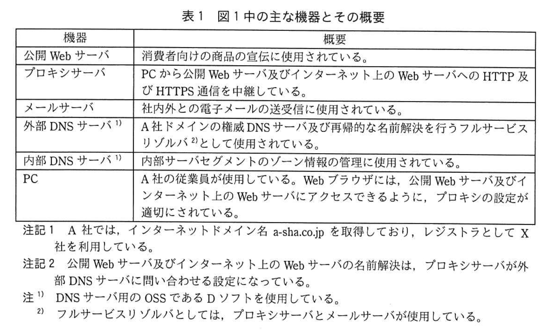– 表1「外部 DNS サーバ」は「A社ドメインの権威 DNS サーバ及び再帰的な名前解決を行うフルサービスリゾルバ」と記載。 - 権威 DNS サーバが停止すると、インターネット上の利用者は a-sha.co.jp ドメインの名前解決を実行できない。