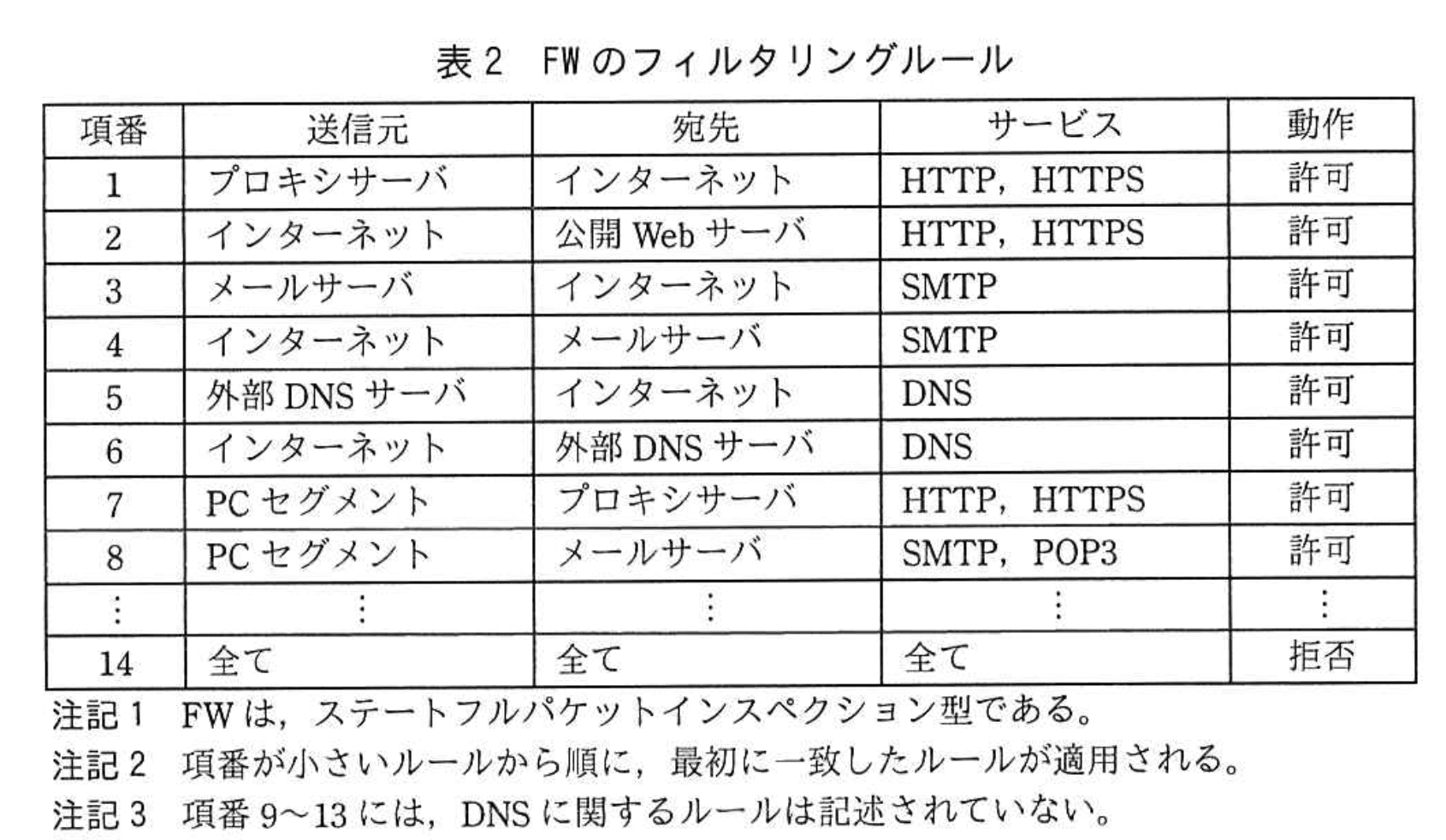 FWのフィルタリングルールを表2に示す。