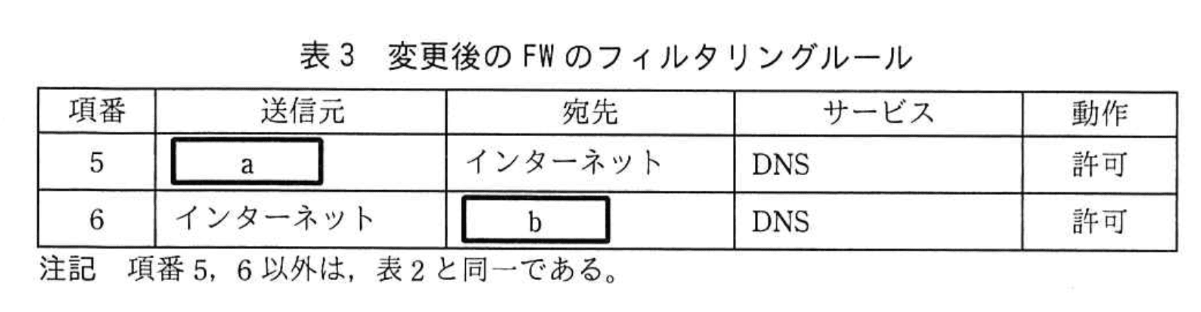 - 問題文は、二つ目の案について「外部DNSサーバを廃止した上で、DNS-HK,DNS-S,DNS-HFというDNSサーバをX社のホスティングサービス上に新設し、…フルサービスリゾルバの機能をDNS-HFに移行する」と明示しています。したがって、FWルール表5の宛先 o はフルサービスリゾルバである「DNS-HF」になります。