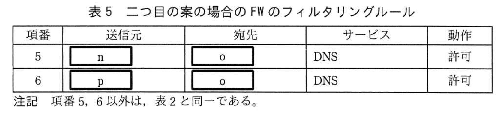 二つ目の案は、外部DNSサーバを廃止した上で、DNS-HK, DNS-S, DNS-HFというDNSサーバをX社のホスティングサービス上に新設し、プライマリの権威DNSサーバの機能をDNS-HKに、セカンダリの権威DNSサーバの機能をDNS-Sに、フルサービスリゾルバの機能をDNS-HFに移行するものである。DNS-KとDNS-FのDMZへの設置は実施しない。この案の場合、FWのフィルタリングルールを表5のように変更する必要がある。