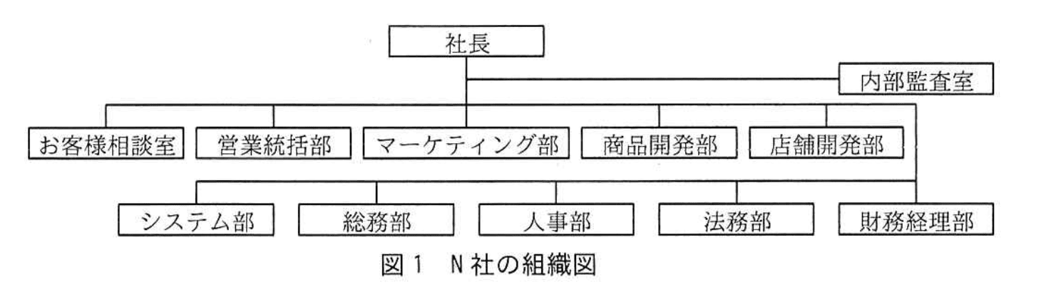 N社は、従業員800名のドラッグストアチェーンである。グローバルに事業を展開する海外の企業B社のブランドライセンスを取得し、同ブランドの下、国内80店舗の展開、及びN社Webサイト(以下、通販サイトという)での通信販売を行っている。N社は、消費者向けの会員制度を設けており、会員は商品購入時に特典を受けられる。N社の組織図を図1に示す。