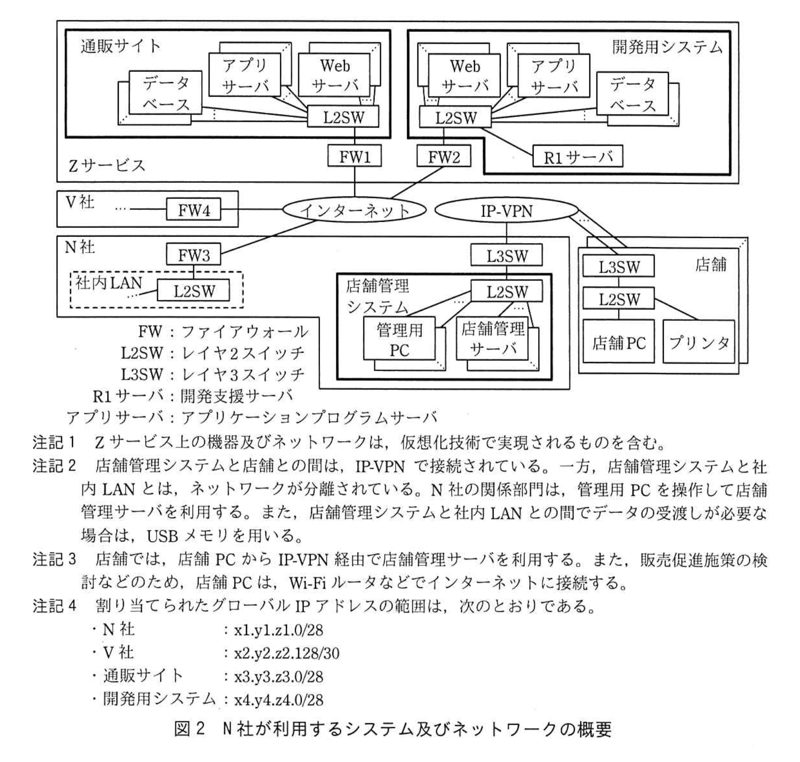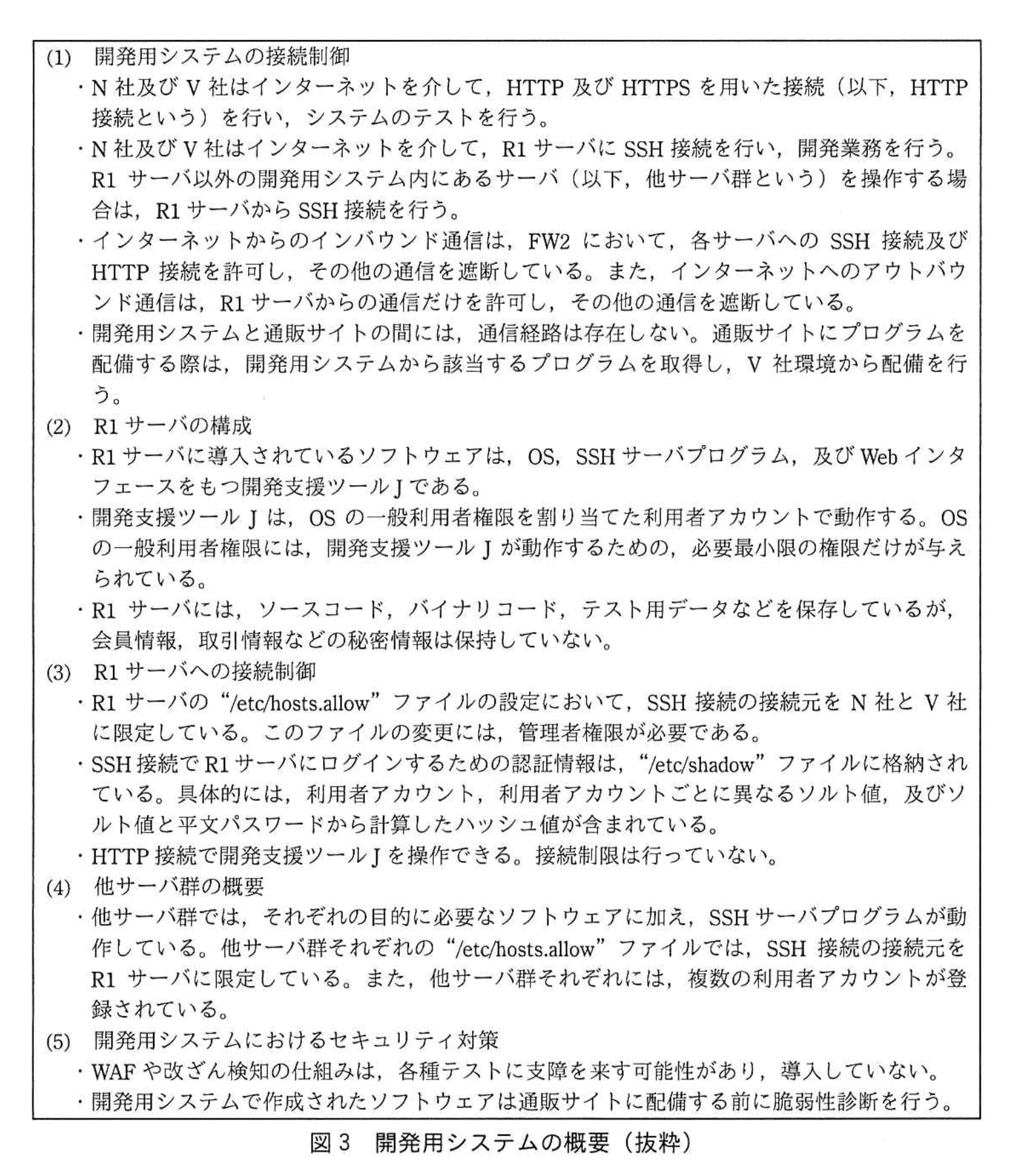- 同じく図3に「N社及びV社はインターネットを介して、HTTP…および…SSH接続を行い、開発業務を行う。」とあります。